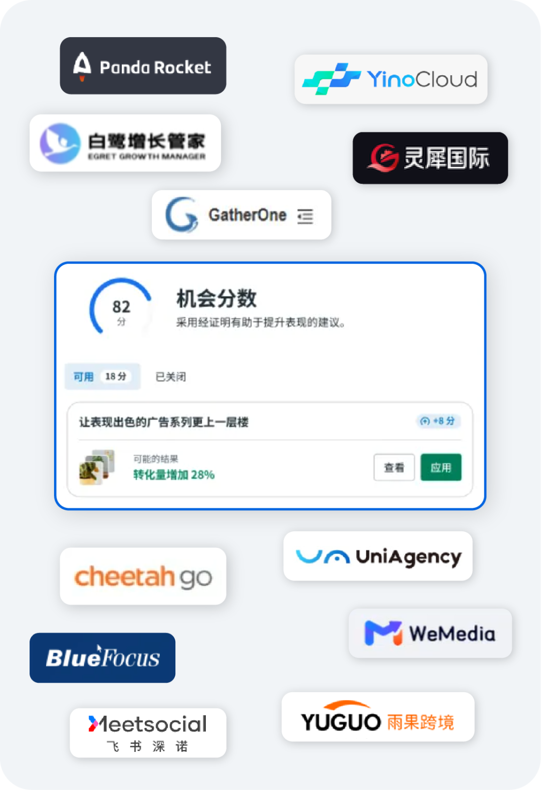 作为出海广告主,你是否也曾面临这些困扰:优化策略枯竭,难以提升成效?缺乏量化依据,无法判断优化建议是否靠谱?广告表现不如人意,急需新的增长突破? 是时候解锁全新广告优化神器! Meta 重磅发布机会分数工具,并携手 11 家官方代理商,推出多项全新功能,一站式解决三大优化难题,全面提升广告表现! Meta x 11 家代理商:联合赋能,全面升级优化功能 Meta 深谙出海广告主需求,持续推出与时俱进的工具,助力应对新挑战、把握新机遇。 目前,Meta 的11家官方代理商均已集成全新机会分数工具,更推出一系列重磅功能,让广告主直接通过代理商的自助广告技术平台,借助以下方案,轻松优化账户表现。 新功能:已被官方验证价值的广告建议 Meta 会基于广告账户的具体表现对症下药,精准提供个性化的优化建议。 所有建议的价值均经实验验证,具备明确数据支持,可有效提升广告表现。 新功能:机会分数(Opportunity Score) Meta 重磅推出的全新广告账户表现指标,帮助广告主优先处理最关键的优化点,有效节省时间。 分数越高,表明广告主采纳系统建议的可能性越大,其广告系列表现随时间推移提升的可能性也越大。 所有优化建议均根据广告账户个性化定制,针对性强,且每一条建议都会根据其潜在价值被赋予相应分值,成效有据可查。 新功能:丰富的表现洞察 Meta 提供官方验证过的表现数据,包括广告建议采纳提升估算 (Lift Estimation)、每次回应成本(CPR)和CPR基准指标等等。 帮助广告主科学评估并及时调整广告策略,从出价、定位到素材优化,全面提升效率。 01 一站式解决三大广告优化难题 缺乏数据验证,无法获取有效优化建议? 现在,广告主可直接通过代理商的自助广告技术平台,轻松获取个性化智能广告投放建议。所有建议均经实验验证,可有效提升广告表现。 广告效果提升乏力,表现无法突破? 通过 Meta 机会分数明确优化路径,轻松优化广告投放,可有效降低获客成本并提升广告投资回报率,助力企业实现更快速稳健的业务增长。 缺乏智能工具支持,难以识别增长机会? 借助全新智能工具快速识别高潜优化点,及时作出明智投放决策,轻松把握增长机遇。 02 用数据说话,成效看得见 采用机会分数和建议的中小企已斩获成效 CPA中值平均降低 12%, 显著提升营销效率 立即前往您的Meta 官方代理商广告平台,体验这些强大的全新功能,或联系您的代理商了解更多详情。