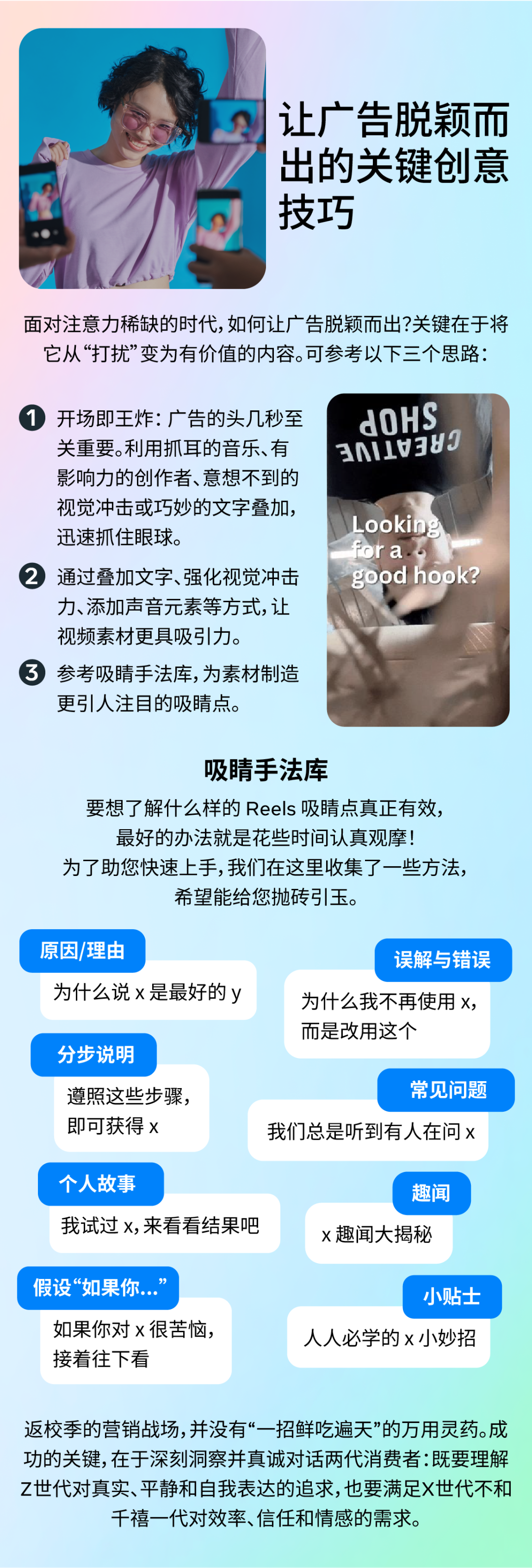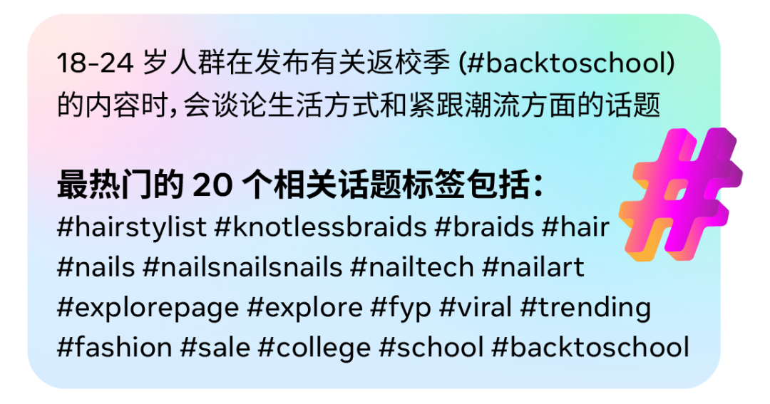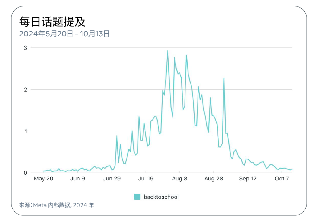 随着日历翻向九月,一股熟悉的消费热潮已然酝酿。在Meta 平台上,关于#backtoschool (返校季)的讨论量从七月中旬开始攀升,在八月至九月初达到顶峰。 这不仅是一个销售旺季,更是一个深刻的文化分享时刻。然而,面对以Z 世代为主力军的年轻消费群体,什么样的营销策略才更奏效? 对于当下的主力消费军Z世代学生而言,返校购物远不止是采购清单。这更像是一场关于生活方式(#collegelife)的自我表达。从发型(#hairstylist, #braids)到美甲(#nails, #nailtech),从时尚穿搭(#fashion)到必备的电子产品(#laptops),他们在社交媒体上分享的,是对新学期、新形象的全部构想。 在Z世代为新学期兴奋购物的同时,他们的父母——X世代和千禧一代,则扮演着“首席财务官”和决策支持者的角色。因此,了解他们的社交媒体行为和消费动机也至关重要。 品牌吸引X世代和千禧一代的“父母”类消费者的关键思路:以引人共鸣、直白易懂、娱乐受众的方式真实呈现父母群体的形象。