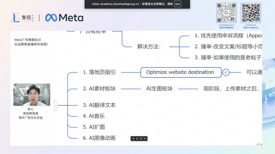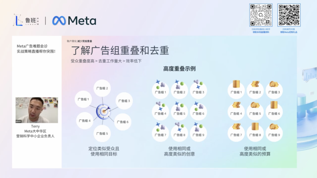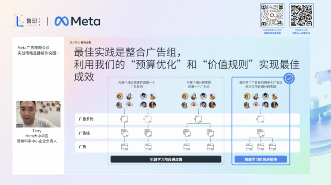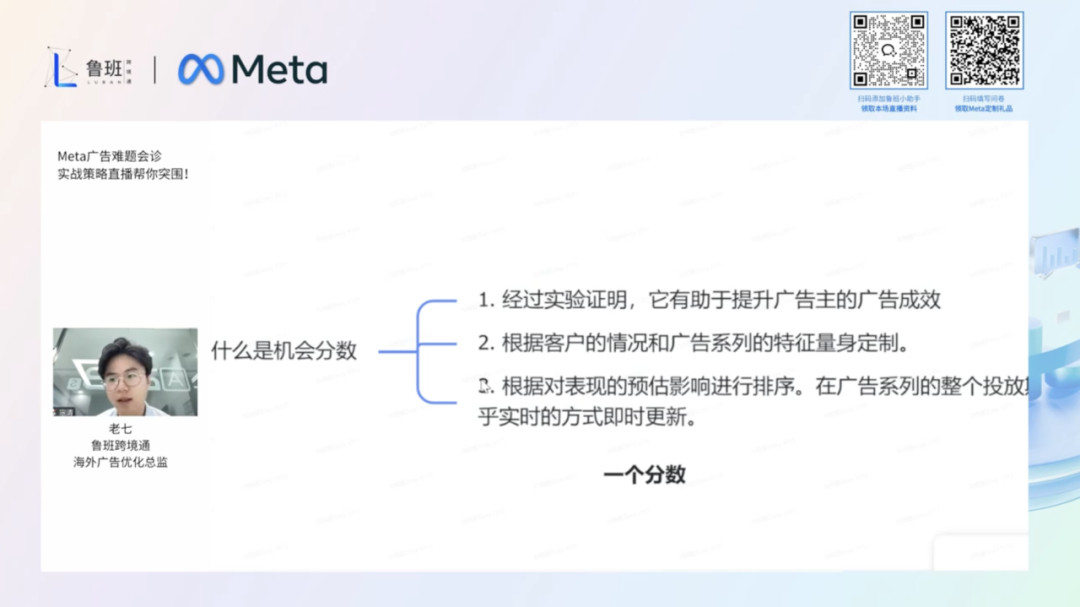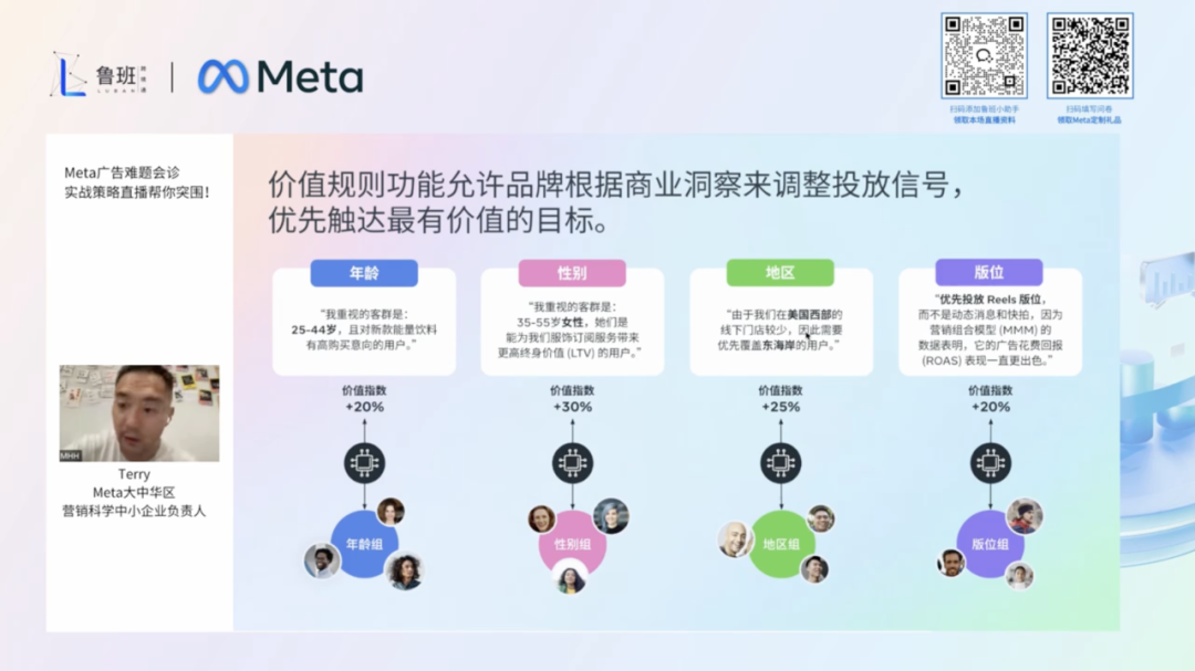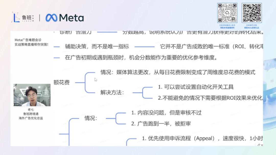 Meta 分享——从结构优化到工具赋能,夯实广告投放基础 Meta 大中华区营销科学中小企业负责人 Terry 围绕“如何用科学方法提升广告效率”展开,核心聚焦两大方向,每一个策略都附带数据支撑与实操建议: i) 简化广告结构:告别“碎片化”,降低成本+加速学习 很多卖家会遇到“广告组越建越多,效果却越来越差”的问题,嘉宾指出核心原因是广告组碎片化:相似受众、相同目标、接近预算的广告组重复创建,导致两大问题——一是广告长期卡在“机器学习阶段”,优化速度慢;二是竞拍重叠严重,同一批用户被多个广告组反复触达,既浪费预算又影响用户体验。 针对这一痛点,Meta 给出明确解决方案:整合相似广告组,为每个细分客群(而非每个单品)设置1个广告系列+1个广告组,避免“小而散”的结构。数据显示,每周转化次数超过50次的整合型广告组,单次购物费用比碎片化广告组低28%(数据来源:Meta 2022年10月购物优化事件分析),预算利用效率显著提升。 ii) 预算优化+价值规则:灵活调控,优先触达高价值客群 在预算管理上,Meta 推荐开启“进阶赋能型广告系列预算优化”,同时通过「广告组层级单日花费限额」设置最低/最高预算,既让AI发挥优化能力,又避免预算失控。 更关键的“价值规则”功能,能帮卖家把商业洞察转化为投放信号:比如针对能量饮料品牌,可给“25-44岁高购买意向用户”设置+20%价值指数;服饰订阅服务可重点倾斜“35-55岁女性(高终身价值客群)”,价值指数+30%;线下门店少的区域,还能给东海岸用户+25%价值指数,优先覆盖。此外,若数据显示 Reels 版位 ROAS 更优,也可设置+20%价值指数,让投放资源向高效渠道倾斜。 鲁班跨境通老七——聚焦实操痛点,拆解一线运营技巧 作为深耕跨境广告的一线操盘手,鲁班跨境通海外广告优化总监老七从卖家日常运营难点切入,分享了3个“拿来就能用”的技巧: i) 简化广告结构:告别“碎片化”,降低成本+加速学习 老七指出,“机会分数”(0-100分)是 Meta 后台隐藏的“广告潜力指示器”(在广告组/系列详情页可查看),分数越高说明系统认为广告更有潜力获得更好的转化结果。但它并不是广告成败的唯一标准,(ROI、转化率仍然更关键),在广告初期或遇到瓶颈时,机会分数能作为重要的优化参考维度。 ii) 广告 Policy 问题:预防+申诉双管齐下 Policy 违规是卖家常见“踩坑点”,老七提到在广告投放过程中,一般会面临两大问题:一是广告花费超额花费,解决方式为尝试设置自动化开关工具,不能避免的情况下则需要根据 ROI 效果来优化广告;二是广告被拒审,这种情况可以优先使用申诉流程(Appeal),速度很快,1小时左右就可以出结果。 iii) 广告层级AI工具:用对工具事半功倍 老七强调,Meta的AI工具不是“越多越好”,而是“分层用对”:1)落地页指引,可通过落地页自动引导用户至感兴趣页面;2)AI素材板块(如AI生图功能,支持保留原背景更换或全内容生成,但现阶段不建议使用全部内容生成功能);3)AI翻译文本;4)AI音乐;5)AI扩图;6)AI图像动画,希望广告主可以有针对性选用各类功能。 本次直播的干货已经帮大家梳理完毕,希望能够给大家带来帮助。鲁班跨境通为 Meta 认证合作伙伴,专注提供 Meta 广告投放、合规申诉、数据优化等全链路实操支持,点击访问鲁班官网: 如需获取本场直播干货资料或定制解决方案可关注「鲁班跨境通」公众号咨询。