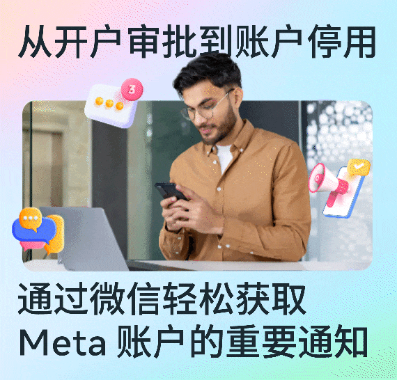 广告账户微信通知服务,全新上线!为提升广告主的运营效率,Meta 将直接向已订阅微信1对1消息服务的广告主,推送开户审批状态通知与广告账户停用通知。广告主可以直接在微信端获取广告账户的最新状态,第一时间采取行动,确保投放顺畅无阻。 为什么要订阅微信1对1消息服务? 以往广告主只能通过广告管理工具(Ads Manager)或邮件接收相关通知,容易出现查看延误,影响响应速度。 现在,当您订阅 Meta 海外营销官方账号的微信1对1消息服务后,您将能在微信端轻松了解广告账户的最新动态,并采取相应行动,大幅提升处理效率。
