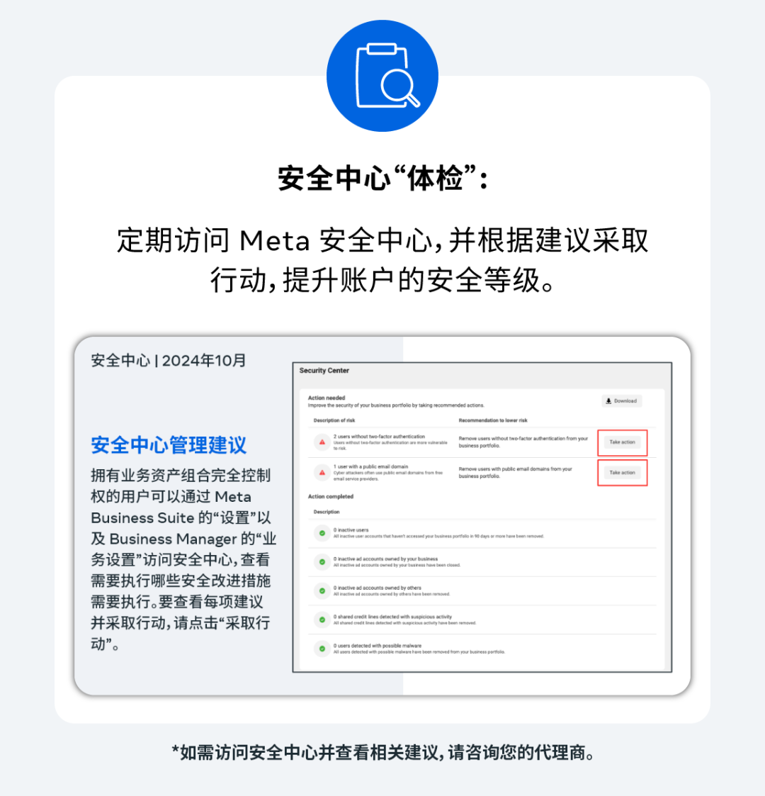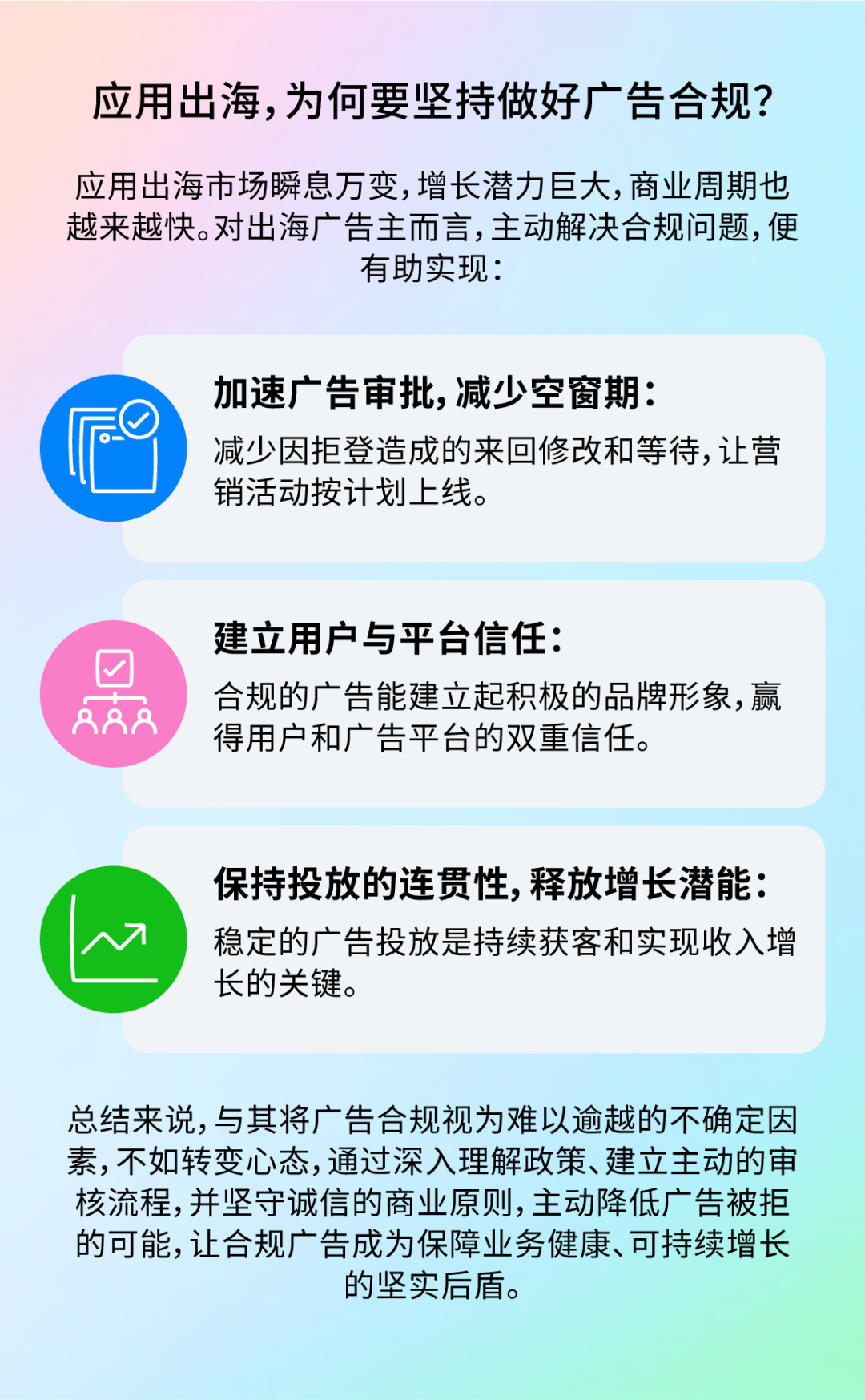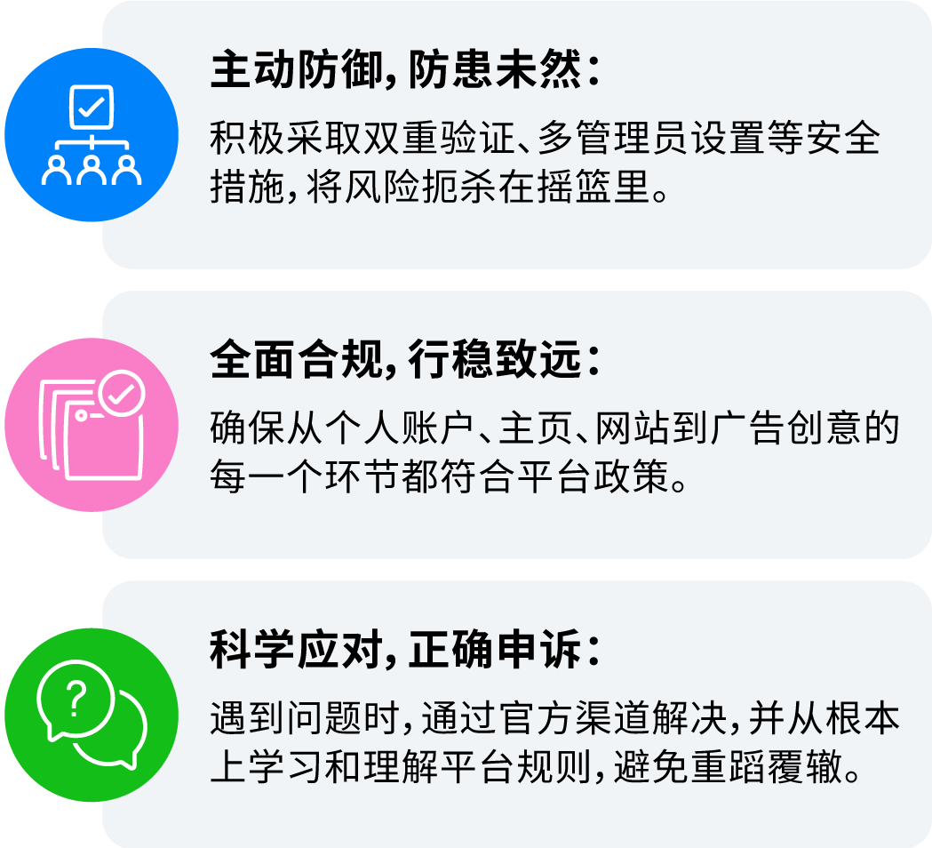 在过去的一年里,我们与大家分享了许多关于Meta 出海营销的干货知识,尤其聚焦于出海征途中至关重要的“安全”与“合规”两大基石。 我们将本年度最受欢迎、最重要的几篇与合规相关文章进行了梳理和提炼,浓缩成这篇精华中的精华,方便大家回顾和巩固。 立即重温出海营销合规资讯,为新一年的出海征程积蓄能量,走得更稳、更远! 为Meta业务资产修筑防火墙 了解保护Meta业务资产的具体方法,远离欺诈和诈骗: 务必使用通过Meta官方渠道创建的真实业务资产,包括个人账户、广告账户、商务管理平台等,切勿轻信或购买来路不明的第三方资产。 定期检查相关人员的用户权限,及时移除不活跃的广告账户。 定期访问Meta安全中心为广告资产“体检”,根据系统给出的建议采取行动。 想了解更多关于业务资产安全的维护技巧? 立即阅读原文: 简单几步完成公司验证,保障广告稳定投放 账户安全了,如何让广告投放更稳定、更具扩展性? 完成公司验证的账户更可解锁两大隐藏优势: 更高的花费上限,以便在营销关键期拥有更大的投放自由度。 从容应对未来可能出现的合规新要求,确保营销活动持续在线。 阅读原文,了解公司验证的详细流程与好处: 品牌被“山寨”了?收下这份Meta品牌安全指南 完成了对内资产的加固和对外身份的认证,我们还需要警惕外部的侵权风险,保护好我们最重要的无形资产:品牌。随着品牌影响力扩大,被恶意模仿、歪曲信息甚至“山寨”的风险也随之而来。 参考“强化保护-密切监测-解决问题”的三步闭环策略,有效应对侵权风险: 第一策:强化保护,防患于未然。 可采取的措施:开启双重验证、申请官方认证徽章。 第二策:密切监测,及时发现潜在风险。 可用的工具:广告资料库、Rights Manager和品牌权利保护工具、Meta业务支持中心 第三策:果断采取行动解决问题,将损失降到最低。 可用的工具: Rights Manager和品牌权利保护工具、知识产权举报API,知识产权举报中心 如果想要具体了解如何运用上述Meta措施或工具来保护品牌安全,请阅读原文: 什么是不合理的商业行为?如何避免? 保护好了品牌,我们现在来聚焦广告内容本身。 什么样的广告内容是Meta平台所鼓励的? 又有哪些是明确禁止的“雷区”? 了解Meta 对“不合理的商业行为”的定义,并获取规避此类行为的的最佳实践: 何为“不合理的商业行为”? 推广具有欺骗或误导行为(如骗取钱财或个人信息)的商品、服务或机会,都属此类范畴。 常见的不合理的商业行为包括: 采用明星“照骗”或使用名人虚假代言 落地页与广告 “货不对板” 以虚假价格作为诱饵 过分夸大产品的前后对比效果或宣扬不切实际的效果 想对照检查广告是否存在不合理的商业行为?阅读原文即可查看违规示例和规避雷区的四大检查点: 行业深潜之DTC篇:出海第一步,从资产安全与合规开始 理解了通用的广告内容规则、做好前序准备工作后,我们来看看出海热门赛道:DTC。DTC品牌出海,吸睛的广告创意固然重要,但保障账户和业务的“生命线”安全,才是实现长期稳定营收的基石。 DTC广告主可参考以下资产安全和合规实践要点: 主动防御,积极采取措施保护资产安全 坚持合规运营 遇到问题时科学应对,正确申诉 阅读原文,了解DTC出海常见痛点的应对方案,获取合规最佳实践: 行业深潜之应用篇:应用出海广告主必须了解的避雷法则 我们再来看看另外两个热门出海赛道:应用和短剧,在广告合规方面又有哪些特别需要注意的地方。 先来看看应用出海。 下面罗列了应用出海广告最常见的被拒原因: 广告被拒时,优先检查是否触碰了以下红线: 包含成人或性暗示内容; 宣传应用本身不存在的虚假功能 落地页功能失常或与广告不符 包含不可接受的商业行为 想了解让应用广告丝滑过审的核心要点? 立即阅读原文: 行业深潜之短剧篇:短剧出海广告合规最佳实践 应用广告强调功能真实,而另一个火热的赛道,短剧,则因其戏剧化的内容,面临着另一套独特的合规挑战。 短剧广告“亮红灯”的背后原因: 短剧素材的夸张情节(如掌掴、吐血)、部分团队劳动密集型的粗放运营模式、以及对审核系统的侥幸心理,是导致违规频发的三大主因。 短剧广告主需要格外留心的三类内容: 震撼或惊吓内容(如刀具刺入身体、突出展现暴力死亡) 暴力内容(如夸张击打面部、攻击性手势) 成人或性暗示内容(如近乎裸露、性暗示姿势 想了解具体的短剧合规通关秘籍,请阅读原文: 从资产安全、公司验证、品牌保护,到通用的广告内容准则和细分行业的合规要点,我们共同重温了安全出海的完整路径。希望这篇年度精华汇总能成为出海广告主工具箱中的一份实用地图,在未来的出海航程中为大家指引方向,规避风险。