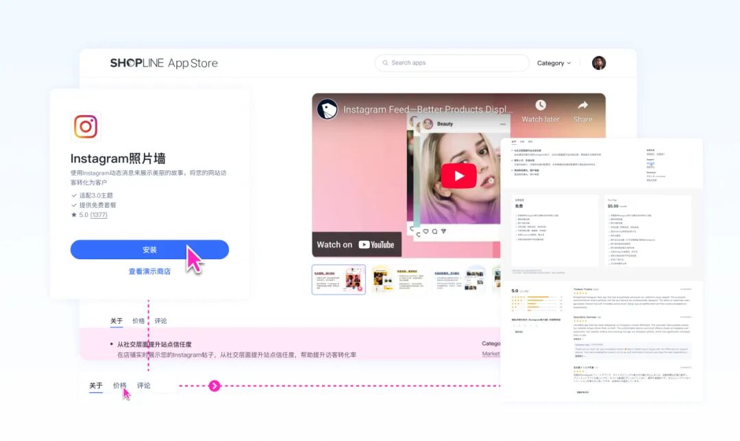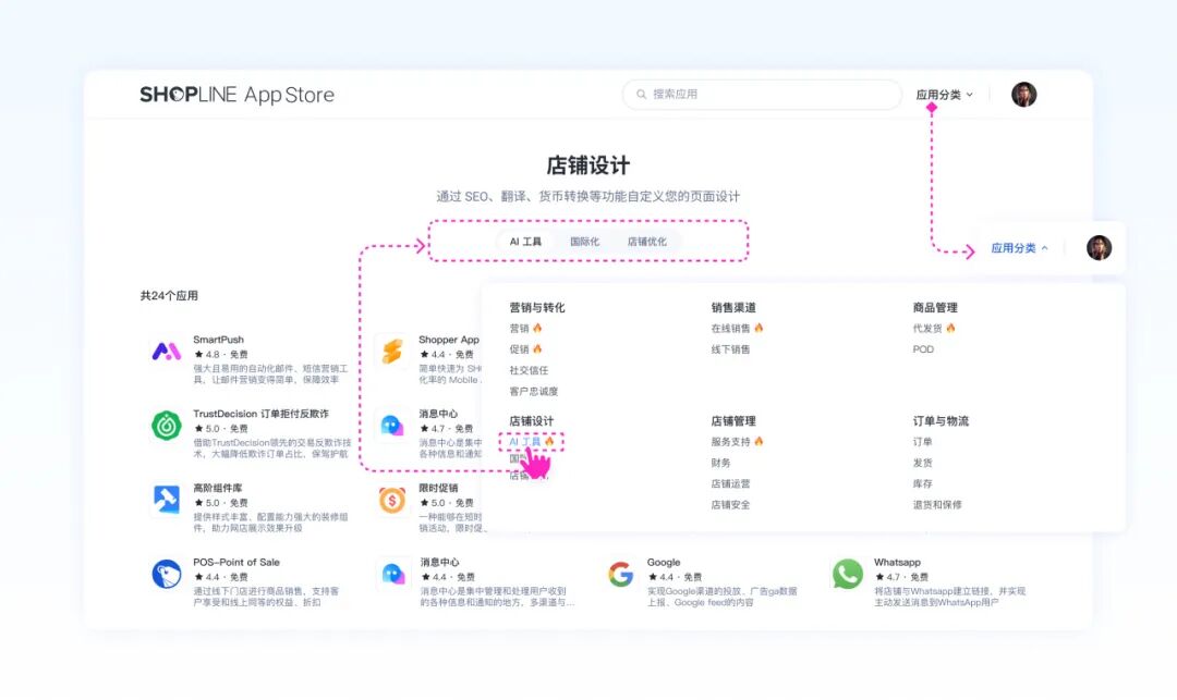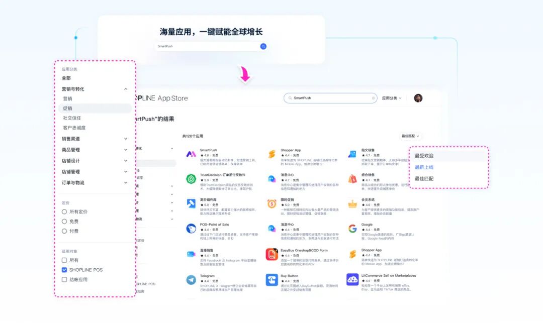 本期重点更新: 【应用市场】 ·首页智能推送:按店铺情况精准匹配应用,新增动态推荐栏目 ·详情页优化:重构信息布局,快速捕捉应用核心价值 ·搜索分类升级:新增多维度筛选,配套精细分类导航 为持续优化商家服务体验,精准匹配全链路经营需求,SHOPLINE 应用市场正式焕新升级! 聚焦 「更智能的匹配、更丰富的探索、更高效的落地」,为商家打造更贴合业务场景的应用服务平台 —— 帮你省去找应用的时间、选应用的纠结、用应用的顾虑,真正实现选对工具、用对工具,助力经营提质增效,解锁业绩增长新可能。 同时,为助力开发者拓宽流量渠道、提升应用市场表现,平台也提供相应的全方位支持,曝光场景多维拓展,转化链路更顺畅。 01 应用推荐与搜索优化 精准提升商家和应用匹配效率 智能推荐升级,优质应用自动送上门 ·我们将根据店铺的行业、规模与需求,为商家定制专属首页应用推荐。商家无需主动筛选,打开即可获取适配性极强的应用资源。 例如,刚入驻 SHOPLINE 的跨境服装新店,打开应用市场首页,系统已自动推荐服装行业常用的智能客服、订单管理、社媒营销类应用,新手商家无需摸索,一键安装就能快速搭建店铺运营基础框架。 ·更懂业务的搜索引擎:能理解模糊需求的强化搜索结合多维筛选条件(如:按功能分类、定价等),让商家快速锁定最匹配的应用。 ·精细化分类浏览:提供覆盖6种经营场景的分类导航,商家可按业务需求浏览发现应用,快速找到对应的应用矩阵。从而精准定位所需工具,发现更多能契合当前经营的实用利器。 比如大促前夕,商家可以进入 “营销与转化” 分类,点选社交信任、广告、营销、客户忠诚度四个精细场景模块,一站式配齐大促所需的营销功能,无需在海量应用中逐个筛选。 从搜索到探索,拓宽生意增长边界 全新的首页结构不再是静态的列表,而是一个充满动态栏目的“探索中心”。我们会结合行业热点趋势、优质成功案例及季节营销节点,精心策划主题应用合集,持续激发商家的经营灵感。 以「一站式店铺增长方案」栏目为例,它帮商家省掉筛选工具的思考成本,精选出从促销增收、风险防控到售后提效的三款优质工具,一站式覆盖经营各环节,轻松完善店铺运营并帮助商家增收。 信息一目了然,选应用不再纠结 新版应用详情页将商家最关心的功能介绍、定价方案、用户评价与应用截图等核心信息,经过精心梳理与整合后,集中呈现于首屏。 页面结构完全契合应用评估中的信息获取习惯,商家无需反复滚动即可快速判断这款应用是否匹配自己的需求、性价比如何,高效敲定经营工具,把更多时间花在提升店铺业绩上。 02 多重曝光与转化路径优化 驱动应用触达率+转化率增长 全域曝光矩阵,触达潜在商家 ·多维推荐位布局:在首页、分类页、搜索结果页、详情页等核心流量入口增设推荐位,实现全链路曝光覆盖,大幅提升应用可见度与触达范围。 ·成功案例轮播:通过开发者与商家的成功合作案例轮播展示,强调应用权威性与市场认可度,吸引更多安装。 比如 SHOPLINE 合作伙伴开发的 AI 选品插件在应用市场上新,以往需要卖家主动并精准搜索 “选品”“自动化”等关键词才能找到;现在首页推荐栏目、分类页 “AI工具” 专区、搜索结果页底部推荐板块等都有可能会同步曝光,覆盖商家从日常浏览效率工具到精准搜索运营解决方案的全场景。 若有跨境卖家使用后,选品效率提升 60%、爆款命中率提高 35%,开发者提供的这类真实案例可以在首页核心位置轮播,搭配卖家的店铺业绩增长截图,让潜在目标商家直观看到 AI 工具解决跨境选品痛点的实际价值。 安装更丝滑,转化路径更顺畅 ·详情页信息架构升级:应用详情页信息架构优化调整,通过图文结合的形式,将应用的核心功能、效率提升亮点等关键信息前置展示,让卖家快速 get 核心价值。同时,详情页始终展示安装按钮,无论商家浏览到功能介绍、价格方案还是用户评价等任何板块,都能随时点击安装,无需来回寻找入口。 ·无需跳转,即刻启用:首页推荐栏目及丰富卡片均配备安转按钮。商家看到契合自身运营痛点的工具时,无需跳转详情页,直接点击卡片上的安装按钮即可完成启用,将原本需要 3-4 步的转化路径缩短至 1 步,大幅降低中途流失率。 往期推荐