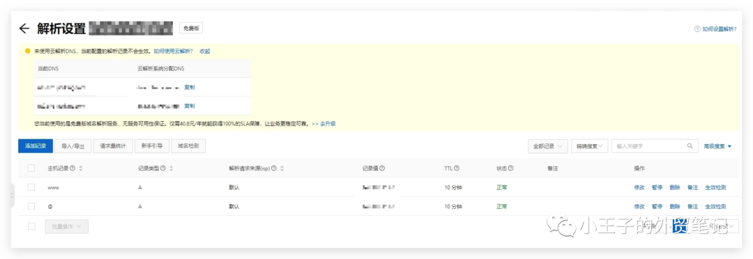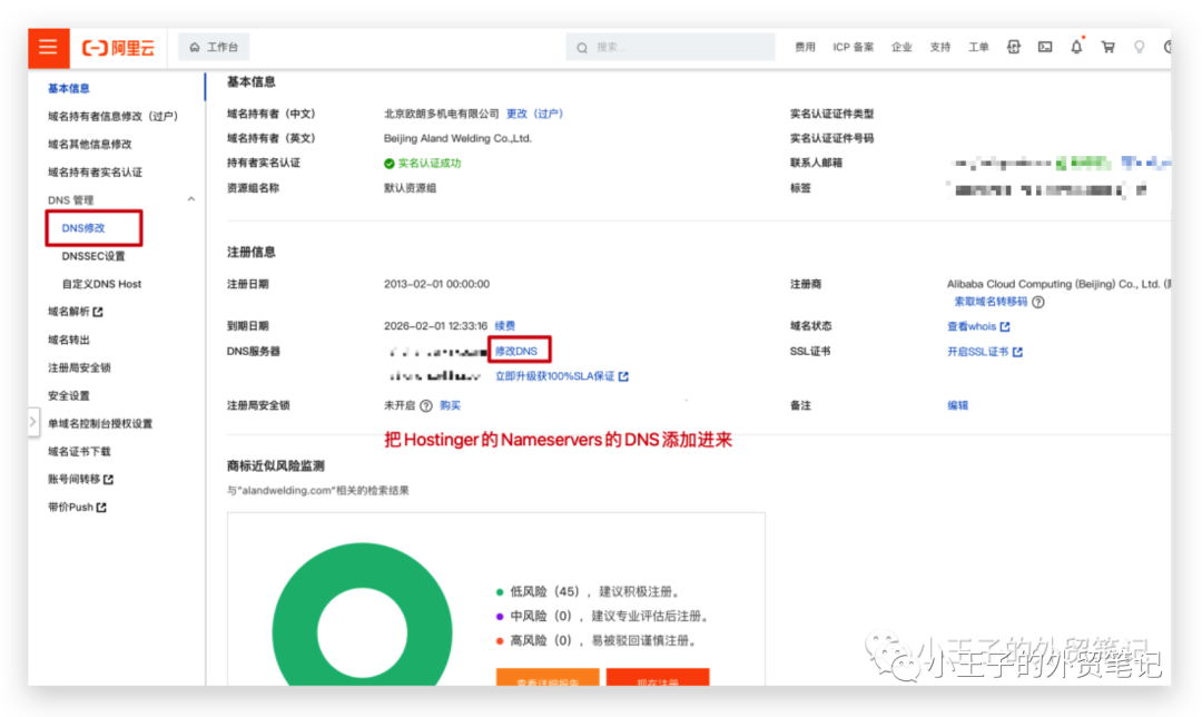 然后点击修改DNS,把Hostinger后台的两条Nameservers按照顺序添加进来