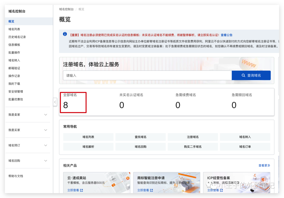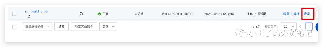 点击数字,就可以看到你购买的所有域名,选择你要解析的那个域名,点击管理