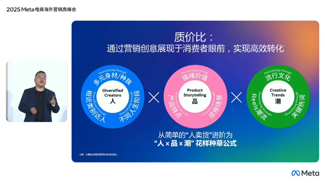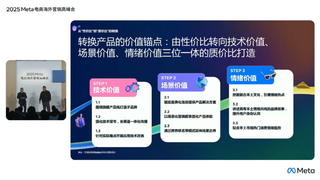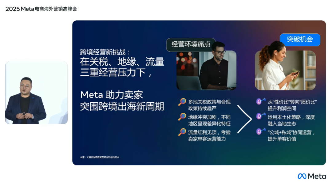 尹志高继而阐述Meta如何助力卖家应对跨境新周期:从追求“性价比”转向“质价比”,拓展利润空间;通过本土化策略深入当地市场生态;并借助“公域+私域”联动提升单客价值。