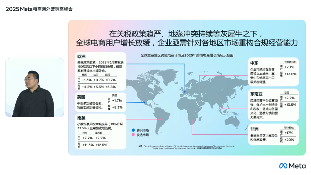 随后,Meta大中华区中小企业副总经理尹志高(Tony Yin)与艾瑞咨询研究总监孙特(Joshua Sun)共同带来题为《跨境突破:营销与运营的新趋势》的分享。孙特首先指出,当前跨境经营面临三大挑战:关税政策与合规要求日趋严格、地缘政治冲突带来区域差异、以及流量红利见顶考验卖家的单客运营能力。