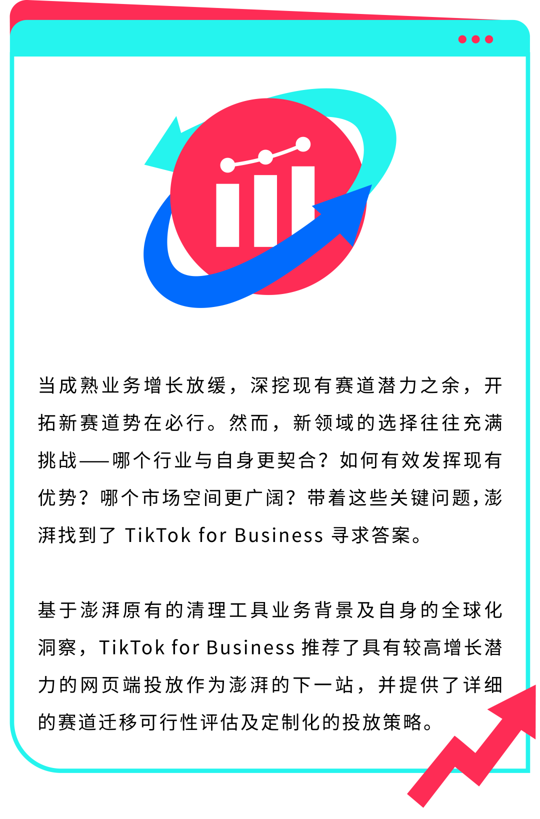 在竞争日益激烈的全球化浪潮下,应用出海已步入覆盖“全生命周期”的精细化运营时代。产品发布后,如何以更低成本实现长线运营?如何在发展滞缓时抓住新的增长机遇?这是每个厂商都会面临的课题。而选择恰当的营销平台,往往能为这些挑战提供高效的解决方案。 本文将聚焦金融、娱乐两大领域,拆解不同属性应用在用户获取、增长突破、业务转型三个关键阶段的实战策略。 伴随日常运营的深入,StarMaker 在持续追求用户曝光与拉新的同时,将降低运营成本确立为当下的关键目标。鉴于 TikTok 平台天然的音乐属性、真人内容生态与 StarMaker 高度契合,StarMaker 将其选定为日常营销的核心阵地,并深度融入达人营销。常态化采用 Spark Ads 广告样式,将达人创作的高质量原生内容直接转化为广告素材进行投放,有效淡化了广告痕迹,显著提升了内容的原生感与用户接受度,最终推动互动效果提升,转化率增长 10%。 与此同时,StarMaker 积极尝试 Smart+ 自动化解决方案进行投放提效。通过系统化测试不同优化目标与出价策略的组合, StarMaker 成功将获客成本降低了 30%。这一举措不仅显著提升了广告投放效果,更大幅节省了日常人工运营的投入。双管齐下,StarMaker 在 TikTok 平台实现了更高效、更经济的用户增长目标。 转化率增长 10% 获客成本降低了30% 当高效获客成为基础能力,如何依托现有用户基础实现价值跃升?全球化竞争的下半场,决胜关键已从“流量获取”迈向“品牌突围”。 然而,Statista 2024 年数据显示,墨西哥信用卡普及率较低,渗透率不足 30%,为 DiDi Card 的长线发展带来了更大的挑战:如何在产品升级优化现有用户体验的同时,高效吸引并转化大量潜在新用户。 在 TikTok for Business 的建议下,DiDi Card 采用了组合策略:尝试按照预算,定量购买 TopView,首日即实现近千万的曝光,迅速与海量本地用户建立联结;策略性运用 VBO,将营销资源聚焦于转化潜力更高的高价值人群,提升整体投放效率。并且,DiDi Card 创新性地采用了 Day 0 ROAS作为核心优化指标,取代评估周期较长的 Day 7 ROAS,直接衡量广告曝光当天的即时转化效果与投资回报。 这一系列举措成效显著,最终使 Day 0 ROAS 实现了 30% 的提升,不仅高效驱动了新用户增长,更成为 DiDi Card 加速渗透墨西哥主流数字支付市场、提升市场竞争力的关键助力。 首日即实现近千万的曝光 Day 0 ROAS 实现了 30% 的提升 当品牌成功破圈并积累了大量的用户资产,如何将这些存量转化为开拓全新增长曲线的动力?这构成了全球化增长下一阶段的核心挑战。 为了高效获客,澎湃选择了具有强大跨域引流能力的 Pangle 作为主要的营销渠道。同时,通过 TikTok Creative Exchange(TTCX)混剪套餐,将海量原始素材自动拆解并智能重组,实现素材生产的规模化与本土化。短短 1 天即可量产 100+ 条符合当地市场需求的广告素材,生产效率获得显著跃升。 澎湃的成功转型让我们看到:庞大的存量用户基础并非增长的终点,依托数据驱动的精细化运营与创新营销工具,它能转化为开拓新增长曲线的宝贵起点。而 Pangle 作为营销伙伴,正通过与 TikTok for Business 的协同联动,持续赋能企业实现价值跃迁。 1 天可量产 100+ 条广告素材 全球化增长没有捷径,关键在于在用户获取、品牌突围、价值深挖的每个关键阶段,找到懂你、懂市场的“增长搭档”。无论是日常运营中的降本提效,还是产品更新时的认知刷新、业务转型期的存量价值深挖,TikTok for Business 始终以适配不同阶段的产品组合,为应用出海提供从“流量触达”到“价值沉淀”的完整助力。 您下一场全球化战役的胜利,或许只需要一个懂出海的伙伴——我们已整装待发。