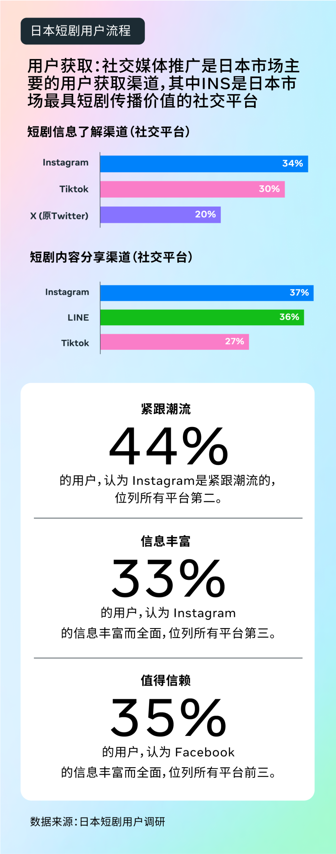 营销必须精准触达用户。Meta旗下的社交平台在日本短剧用户中拥有极高的使用率和影响力,其中,Instagram更是公认的最具短剧传播价值的平台。在这里进行内容营销和用户互动,是引爆话题的关键。