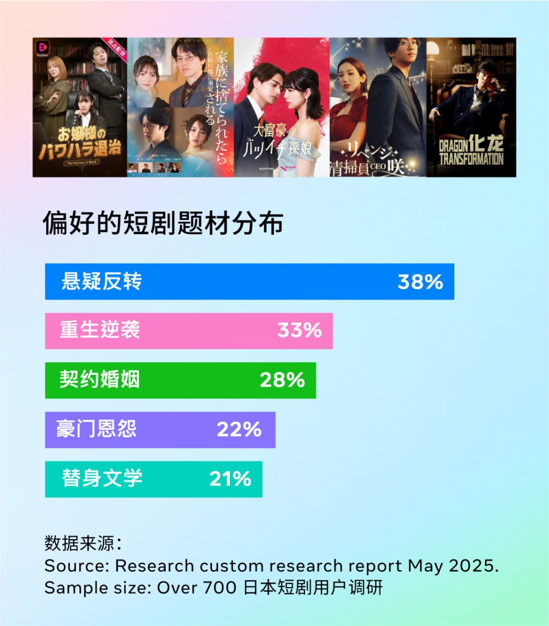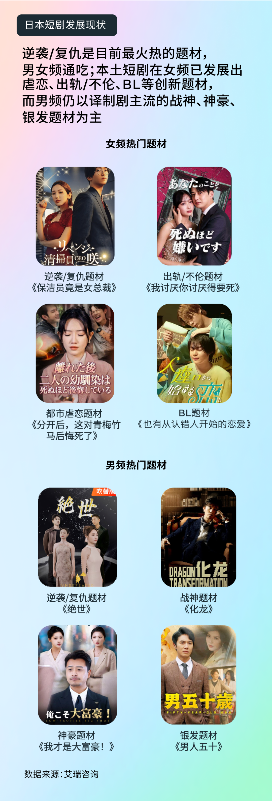 全球短剧“狂飙”,机遇与挑战并存 短剧出海已非风口之争,而是确定的增长赛道。为了助力真正的破局者在这场竞赛中脱颖而出,我们特别策划了《短剧2026:破局者的市场密码五部曲》系列。这五篇深度文章,将从市场洞察、创意技巧、营销策略、变现指南再到成效衡量,为短剧厂商构建一套完整的出海作战体系。本篇作为系列的开篇序章,将首先绘制全球市场的宏观地图,并为短剧厂商精准定位增长最迅猛的高潜力市场。 预计2025年海外短剧的市场规模将飙升至32亿美元,同比增长超过200%【1】,2027年更有望反超中国市场。海外市场2025年Q1的数据也印证了这一爆发:全球应用内购总收入同比猛增4倍,下载量同比猛增6.2倍。【2】当前,日本市场以高达57%的Q1收入环比增速位列全球第一【3】,成为增长“潜力股”。 出海热潮下的冷思考:共同的挑战与破局之路 巨大的机遇面前,盲目入局往往伴随着高昂的试错成本。当前短剧出海普遍面临着三大挑战: 内容创新挑战: “霸道总裁”、“草根逆袭”等强冲突题材虽然是行之有效的流量密码,但长期依赖单一模式,正导致全球观众的审美疲劳。 版权保护困境: 短剧相对较低的制作成本,也意味着极低的盗版门槛。内容搬运、二次剪辑、替换字幕等行为屡禁不止。跨境维权往往成本高、效率低。 政策文化风险: 各国市场的文化偏好、价值观与政策红线差异巨大。如何巧妙规避宗教等敏感内容的同时确保内容合规,是所有出海团队面临的巨大考验。 柳暗花明,日本有望成为短剧出海的下一个优质目的地 日本拥有一个超过950亿美元的庞大内容产业,且网络已成为内容消费最核心的载体,占比超过40%【4】。更重要的是,日本成熟的市场环境恰好能有效应对出海团队的部分核心痛点: 版权保护严格:日本对知识产权的保护力度全球领先,为打击盗版、保障创作者合法收益提供了坚实的法律基础。 文化包容性强:作为文化消费大国,日本市场对多样化的内容题材接受度高,为内容创新提供了肥沃的土壤。 用户群稳固,有良好的内容付费习惯:逆袭、甜宠等类型的短剧,已成为日本用户情感陪伴和压力释放的核心选择,且日本用户对流媒体内容有很强的付费意愿和付费能力。 2025年,日本短剧市场规模达4.8亿美元,在非英语区收入占比超过1/3,已成为该区最核心的短剧市场;而到2026年,这个数字有望翻倍,突破10亿美元大关【5】! 目前,日本短剧市场几乎由中国出海平台主导,TOP 10的应用均来自中国。这片蓝海,正等待着有准备的入局者。 深度洞察:在日本,短剧的受众是谁?爱看什么类型? 决胜日本市场,首先要读懂日本观众。先来看一下日本短剧用户的画像概览【6】: 女性、高学历、职员是主要标签:大学及以上学历的占64%,企业正式员工占17.9% 37%的受访短剧观众居住在以东京为中心的首都圈 受访短剧观众付费群体的平均收入达30.85万日元 再来看看日本市场偏好的短剧题材: 总的来说,原创剧集更受欢迎,强冲突反转题材是当下的主流【7】: 分开来看,女性观众和男性观众的兴趣泾渭分明: 三大关键支柱,决胜日本短剧市场 那么,如何才能在日本市场稳稳落地,分得一杯羹?关键在于三点。 1. 本土化不是选择题,而是必答题 2. 在对的场合,找准目标观众 3. 用对“技术流”,让短剧推广和变现事半功倍 WhatsApp Business 消息传递亦可为短剧赋能: 改善参与度并带动付费 改善客户体验和客户支援 玩转短剧剧推的创意思路: 善用“陪伴式内容”:Sereal+的案例堪称典范。借助虚拟评论员的解说和即时反应,Sereal+增加了与观众的互动,成功提升了短剧内容的吸引力。 热门短剧应用DramaBox利用Meta的“爆款挖掘机”工具,通过AI分析第一方趋势数据,成功从内容库中识别出有潜力翻红的旧剧,不仅盘活了现有资产,还在新剧空窗期维持了稳定的投放成效。 解放双手,拥抱AI赋能的自动化工具: 此外,还可借助Meta API打造智能广告系统,全面革新广告从创建到优化的全流程。 采用混合变现模式,充分解锁短剧营收潜力: 全球短剧市场的爆发式增长已成定局,而日本,凭借其巨大的市场潜力和成熟的商业环境,正成为继北美之后的必争之地。想了解更多关于日本市场的用户画像、热门题材和实战营销秘籍吗? 但知道市场在哪,只是第一步。如何打造出能真正击穿当地观众心防的爆款剧本?什么样的创意才能在广阔的短剧库存中脱颖而出? 敬请期待本系列第二篇章:《创意策略最佳实践》,我们将深度拆解跨文化内容创作和宣传的核心秘诀。 资料来源