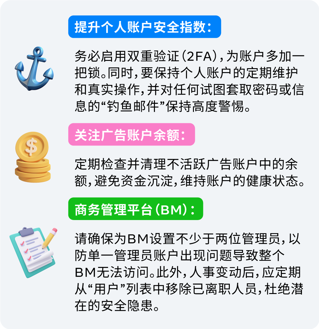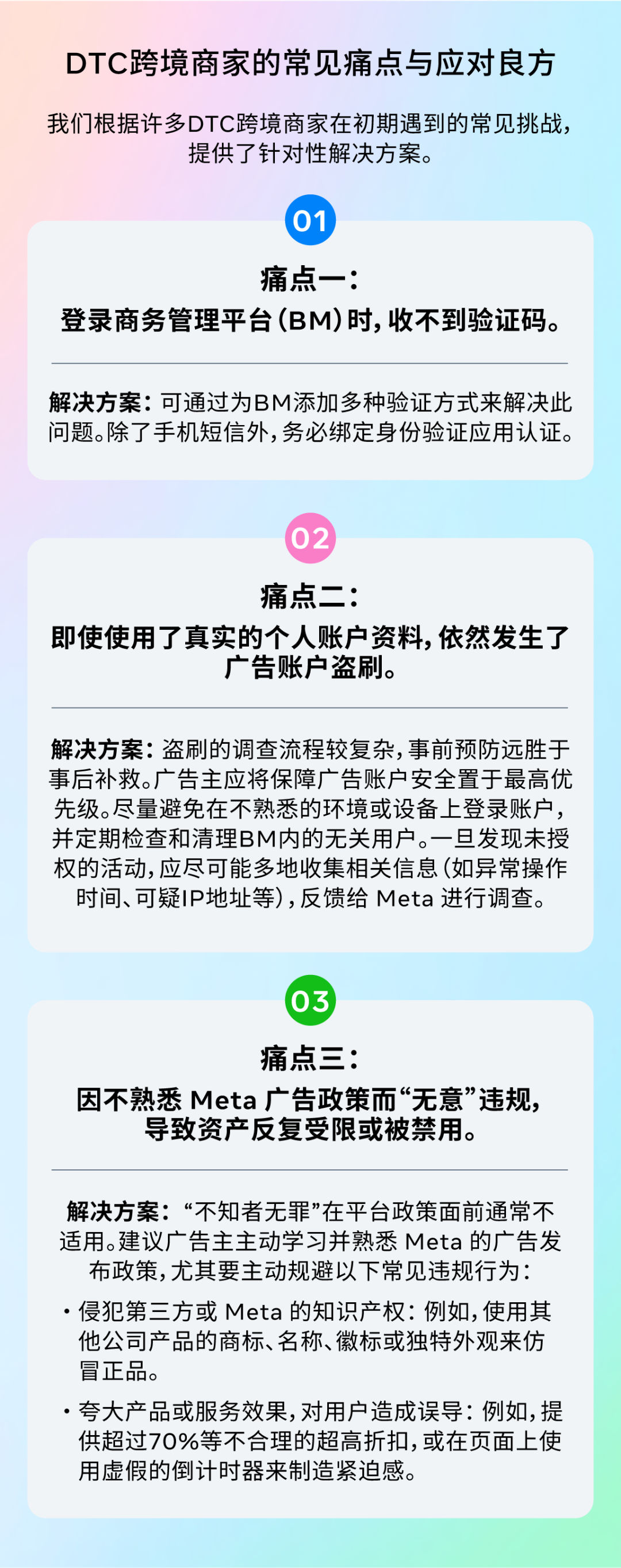 DTC 品牌出海的浪潮已席卷全球,无数充满雄心的跨境商家正进军海外市场。在徜徉这片充满机遇的蓝海时,吸睛的广告创意固然重要,但保障账户和业务的“生命线”安全,才是实现长期稳定营收的基石。 这篇指南将为 DTC 广告主提供一份清晰的资产安全和合规实践手册,为出海征途保驾护航。 在出海营销的过程中,广告资产的安全至关重要。一个看似微小的疏忽,都可能给业务和品牌安全带来巨大风险。DTC 广告主需在以下几方面额外留心 投入时间与精力做好安全与合规,绝非多此一举,而是可以带来实实在在的商业回报。 提升资产安全、做好政策合规,是为了保障广告能够顺畅投放,从源头上降低广告费被盗刷的风险,从而延长品牌的生命周期、提升发展潜力,最终达成扩大海外知名度、加速全球化扩张步伐的效果。 对于DTC出海商家而言,通往成功的道路不仅需要创意和勇气,更需要智慧和谨慎。请记住以下核心要点: