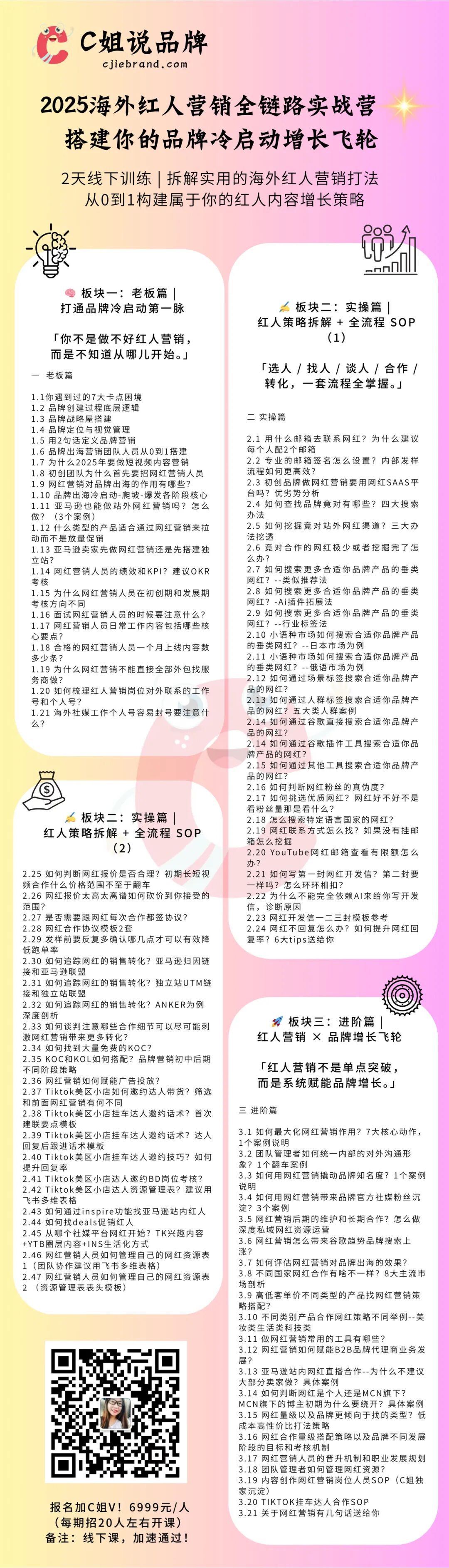 有些品牌砸50万找红人连个水花都没有,而有些品牌仅仅靠送样品就能引爆市场——这到底是怎么回事? 我来说一个真实的案例:在我职场生涯的第三家品牌,是个3C数码品牌。当时我们自研ID、私模开品了一款蓝牙耳机,从2022年6月到2023年6月,整整一年时间,通过“红人营销+官媒自拍短视频”,在海外社交媒体上做到了10个亿的流量曝光! 最关键的是——这一年销量达到近一个亿,我认为很大部分都要归功于红人营销的力量。 那问题来了:为什么别人用样品费就能做到,你花大价钱却不见效? 中小卖家做品牌最容易踩的坑,第一个就是麻木相信——花一笔钱买个红人营销工具,或者找个外部服务商上线几十个红人,就以为红人营销完成了,品牌就做起来了! 不管是SaaS工具还是服务商,费用都不小:少则几万,大则几十万。但这根本解决不了品牌长期建设的问题!红人营销本质上是打地基,需要长期坚持,绝不是短期一两次就能搞定的事情。 有些老板知道要自己沉淀资源,就开始招人——结果招来些没法下场干活的职业经理人,动不动就要高预算。中小品牌0~1阶段预算有限啊!人不对,后面每一步都错,可能花超出正常5~10倍的钱,还拿不到结果! 还有老板找到了人,但打法又错了:非要从高粉丝量大V红人开始找!现如今高粉丝量红人报价高、难谈,中小品牌做营销起步时公司内部又没预算,直接卡死,最后觉得这事无效,干脆不做了! 这三个误区让多少卖家白白烧钱? 那问题来了——到底该怎么选红人才能不踩坑呢? 说实在的,选红人首先别太看重粉丝量!哪怕只有几千或一两万粉,只要内容符合这三个标准就值得谈合作: 这就是为什么中腰部红人堪称低成本高回报的秘密武器!跟头部红人相比,优势太明显了: 成本优势:跟百万粉博主合作可能要1万刀,但中腰部红人可能只需要样品费甚至免费! 内容优势:现在短视频时代根本不看粉丝量——任何博主都可能出爆款!因为短视频传播是去中心化的,靠的是内容质量不是粉丝基数! 数量优势:可以用更低成本谈成大量合作,批量产出优质内容! 注意啊——重点看内容质量和真实数据,别被粉丝量忽悠了! 你知道我往期的学员和客户里面,有多少人曾经砸钱砸到怀疑人生吗? 有些老板在没有遇到我之前,已经花了50万到100万去找大粉丝的网红,或者是找外包服务。但最终发现——不管是品牌曝光、知名度还是销量,都没有什么实质性转变!团队更是毫无成长 但是在学习之后呢?他们彻底调整了策略,把目光转向专注在中腰部垂直红人。这样一来,红人营销的成本直接趋近于0——固定费用几乎没有了,主要就是发样品! 当然,这里有个非常关键点:产品选择。我们会建议选择更适合发样、更符合短视频传播特性的产品。假如目前亚马逊卖的那些品都不合适建议老板赶紧去开品!开适合传播的品来带动你的品牌!否则就别想又低成本又有高流量! 比如说—— 一个做iPad保护壳的客户,在遇到我之前完全不知道怎么下手。但合作一年后,他们: 老板后来特别感激地说:"这效果,比之前砸50万强太多了!团队也搭建成长起来了"(据说在认识我之前到处砸钱不止50万,还很焦虑!) 这就是样品费策略的魔力——用最低的成本,撬动最大的品牌增长! 红人营销这事儿真的不能瞎砸钱。我在线下课展开讲的三个核心知识点,第一个就是关于给红人的预算和砍价标准。过往他们可能会说,哎,这要多少钱,那要多少钱,但在我的概念里,0~1阶段就分长视频和短视频,最高预算绝对不能超过某个标准,否则绝对踩坑! 第二个知识点是红人的筛选标准——从以前只看粉丝量和播放量,到现在我看内容垂直度、真实互动和评论区质量。 第三个就是如何找到精准垂直红人的标签搜索法和人群搜索法! 还有很多团队搭建考核方面的细节! 具体我们12.19-20号线下两天品牌出海红人营销训练营见!(第十期啦,懂的都懂!扫码报名)