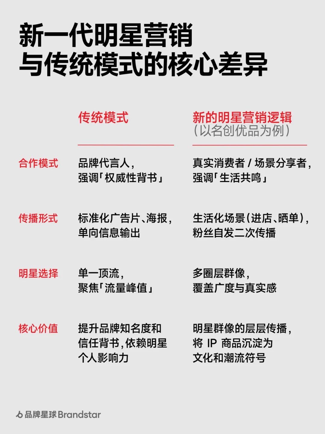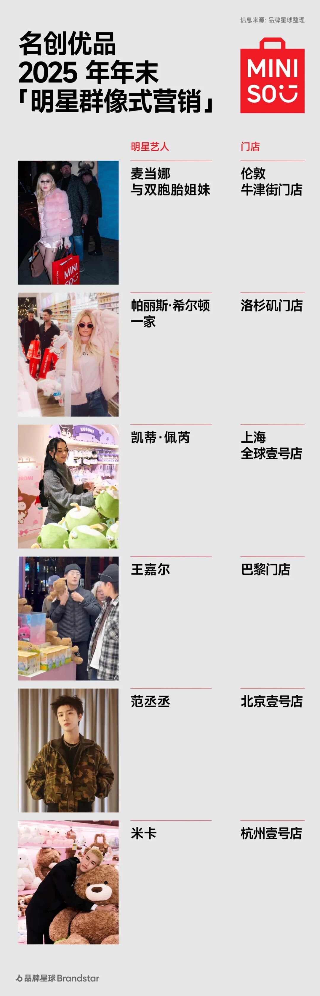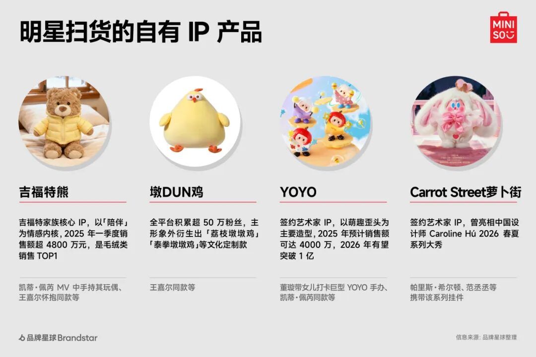 近期,名创优品(MINISO)俨然成为了一众明星的「打卡地标」: 「水果姐」凯蒂·佩芮在《Bandaids》MV 中手提品牌红色购物袋、露出「吉福特熊」公仔的画面引发热议;而来到中国巡演,她还现身上海南京东路名创优品全球壹号店扫货,并与粉丝亲切互动。 凯蒂·佩芮 MV 中露出的 MINISO 包装及公仔 类似「明星扫货」的场景近期正高频地发生在名创优品全球门店里: 帕里斯·希尔顿携家人在洛杉矶门店「沉浸式扫货」,保镖拎满购物袋的画面热传网络;王嘉尔怀抱吉福特熊、范丞丞进店选购进组物资等场景也刷屏社交平台,带动大量讨论与产品种草。 明星营销并非新鲜事,群像式曝光也非名创优品的首创,但在我们看来,这次案例凸显出的,恰恰是明星叙事模式在被更具「活人感」的方式取代──明星从广告代言人回归「真实消费场景」,粉丝也从「被动看广告」转向「主动追同款」。 本篇内容想通过名创优品的案例,来观察当下明星营销究竟在发生何种变化? 明星群像效应 与场景化追星热潮 从欧美名流帕丽斯·希尔顿、凯蒂·佩芮、麦当娜,再到华语艺人王嘉尔、米卡、董璇、范丞丞等,名创优品的明星「阵营」可以说覆盖了不同地域、年龄与兴趣的粉丝圈层,尤其更通过密集曝光,一波接一波的传播,为品牌在短期内凝聚了大量关注。 其中,除了策划节奏紧密外,我们发现在这场明星群像式营销的背后,更值得关注的是其背后明星营销逻辑与叙事方式的转变: ➊ 变化一: 不依赖单一顶流代言,群像式营销覆盖多元圈层 与传统依赖「单一顶流代言」的模式不同,名创优品的明星阵营呈现「跨圈层、广覆盖」的群像特征。 这种做法确保了影响力渗透至不同人群,避免依赖单一个体,同时也让话题度的传播和发酵更为持续,而非局限于一次性曝光,而是依托不同明星艺人在多样场合的持续露出,不断制造新话题点,形成远超单一代言的传播合力。 长期来看,焦点更易沉淀为品牌资产,而不仅是明星个人的粉丝营销。 同类案例中,近期我们看到群像策略的巧妙运用是来自山下有松──不依附单一形象,通过李娜、蒋奇明、文淇等不同气质人物的合作,形成独有的「人物地图」; 在上海「风生・造物」的品牌展览中,品牌大使蒋奇明、文淇,品牌挚友李娜,演员吴彦姝、郭柯宇,国际超模雎晓雯,歌唱家韦唯等众多明星艺人出席,更以「群力」形成了一副难以复制却气质统一的群像画面。 ➋ 变化二: 从「品牌代言」到「生活共鸣」,营销走向「去广告化」 传统明星营销的本质是「付费背书」,通过精致的广告片、标准的广告话术传递品牌价值,但名创优品的明星露出则在剥离「广告感」── 明星不再是「念台词的工具人」,而是展示真实消费状态:董璇带女儿打卡 YOYO 手办是「亲子生活场景」,范丞丞选购进组物资是「职场需求」、王嘉尔俏皮怀抱公仔,水果姐亲切与粉丝互动…… 董璇在社交媒体上分享和女儿打卡 MINISO 门店 这些场景与普通消费者的生活高度重合,网络上还出现热议的帖子例如「这些明星到名创优品买了什么」。当你发现聚光灯下的明星购买的是同你一样的生活物件时,品牌的叙事也就自然融入了「生活场景」中。 如同 Lisa 晒出喜茶带动海外同款热销,日常分享因其真实可信,更易激发好奇心与种草消费。 Lisa 在社交媒体分享日常生活,露出喜茶引发产品热销 ➌ 变化三: 联动线下场景,实现「同款消费」到「门店追星」闭环 当明星营销与线下场景深度绑定,便创造了「可触摸、可参与」的消费体验。 王嘉尔的吉福特熊同款、范丞丞的进组日用品、水果姐的玩偶手办,都是粉丝可轻松购买的平价单品,这种「明星买得起,我也买得到」的亲和亲民,直接激发种草与购买欲望。 同时,「进店选购」也为粉丝提供了具象的「追星落点」──上海南京东路的全球壹号店因明星打卡成为网红地标,大家带着「寻找明星同款」的目的进店,完成消费后再通过社交分享打卡体验,形成「明星种草-粉丝到店-二次传播」的闭环。 尤其是名创优品的「超级门店」,例如旗下门店定位最高级的 MINISO SPACE,包含有迪士尼城堡微缩景观、Chiikawa 主题墙、三丽鸥 DIY 工坊等互动区域,这些如乐园般的强体验式场景,更加可为明星到店提供丰富多元的场景,以及流量的承接转化,也有助将短期热度转化为长期经营资源。 ➍ 变化四: 赋能自有 IP,实现明星与 IP 的「双向放大」 值得注意的是,这波明星露出中频繁出现的是名创优品的自有 IP,如吉福特熊、墩DUN鸡、YOYO手办等。 点击可查看大图 如今,名创优品重要战略之一便是「顶级授权 IP+独家自有 IP」驱动,以此来覆盖全年龄段的消费者。名创优品曾依托迪士尼、宝可梦、三丽鸥等顶级 IP 创造出不俗的成绩,但同时也在持续加码自有 IP 的建设。 此前财报会议里,名创优品就指出说到授权 IP 的「短板」──容易造成同质化严重、议价权受限等弊端,而独家的自有 IP 则有助于掌握定价权、沉淀品牌资产。 虽然短期内自有 IP 的成绩还无法达到授权级 IP 的影响力,但自有 IP 将成为公司发展的战略重点,目标自有 IP 销售占比可达到 30%,预计 2028 年占比提升不低于 50%。 名创优品独家自有 IP 可见此次的明星营销不仅为品牌带来流量,也为自有 IP 注入热议话题与种草机制,助推其热度的提升。这次在水果姐演唱会上频繁露出的吉福特熊公仔,显然