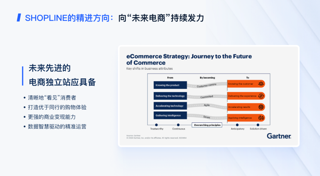 01 盛会启幕:共绘“未来电商”新蓝图 当“未来电商”从概念照进现实,一场关于品牌出海新范式的深度探讨已在深圳落地生根。 11月21日,2025 SHOPLINE全球生态共生大会隆重启幕,标志着行业正式迈入以技术驱动、生态共融、确定性增长为核心的新阶段。作为全球零售解决方案商,SHOPLINE未来将更深度地立足于中国,秉持 “更懂中国商家、服务全球市场” 的理念,通过领先的技术架构、全方位的产品矩阵与本土化的深度服务,赋能中国品牌在全球市场构建可持续的竞争壁垒。 本次峰会汇聚了超过200位行业精英,包括知名DTC品牌卖家、跨境生态领军伙伴与资深技术专家。现场思想激荡,交流热烈,在主题分享与圆桌对话中,围绕AI落地、全球化布局、合规战略、跨境全链路技术架构、消费者洞察等关键议题展开了深度碰撞与务实探讨。 与峰会同步举办的技术开发闭门论坛全面展示了SHOPLINE技术开放生态的深度布局,为开发者及合作伙伴呈现了完整的技术蓝图与创新解决方案。 我们衷心感谢所有与会嘉宾的真诚分享,并特别鸣谢本次大会的联合共创伙伴(排名不分先后):Meta、PayPal、飞书逸途(上海)网络科技有限公司、菜鸟国际物流、Newsbreak、Seel、Oceanpayment、ClipClap.ai、若聚凡星、广州奇赞科技有限公司、常州熵减科技有限公司、品牌方程式和杭州卧兔网络科技有限公司 等伙伴的鼎力支持。正是跨境生态各方的聚力同行,共同铸就了这场高规格、高密度的行业盛会。 左右滑动查看更多图片 这不仅是一场峰会,更是一次行业风向标的确立。现场凝聚的共识与输出的前沿洞察,将为跨境电商的未来发展提供清晰的方向指引与坚实的理论支撑,其深远影响必将持续渗透至每一位从业者的战略与实践中。 02 大咖观点:全链路揭晓品牌出海新路径 在一天的高密度分享与交流中,一个共识愈发清晰:面对“未来电商”,我们已拥有清晰的行动路径与坚实的技术底座。正如大会所指出的精进方向——一个先进的电商独立站应具备四大能力:清晰地“看见”消费者、打造优于同行的购物体验、更强的商业变现能力,以及数据智慧驱动的精准运营。这正与Gartner所定义的电商演进路径高度契合,即从“了解产品”转向“了解客户”,从“交付技术”迈向“交付体验”。 本次大会正是这一演进路径的生动实践。十余位行业领袖,围绕这些核心能力,从平台战略、技术架构、市场洞察到合规风控,系统揭晓了通往“未来电商”的具体出海路径。 峰会主论坛 在2025 SHOPLINE全球生态共生大会上, SHOPLINE 乔冠元分享了公司的业务进展与战略布局。业务方面,SHOPLINE实现收入规模同比翻倍增长,成功完成多个行业标杆客户迁移,覆盖庭院机器人、时尚家居、假发等热门品类的知名品牌,充分验证了平台服务头部客户的技术实力。生态建设成效显著,插件总数突破500个(包含客户私有化运营和开发),2025年新增80余个,通过私有化部署能力持续丰富商家运营工具。 战略布局上,SHOPLINE将重点聚焦AI电商领域,积极响应行业技术变革,加强平台在AI应用层面的布局。同时,公司将持续深化生态合作,投入专项资源赋能合作伙伴,通过共建共赢的开放生态,共同推动跨境电商行业创新发展。 左右滑动查看更多图片 会上,SHOPLINE CTO王志猛正式发布全新SHOPLINE 3.0主题,以突破性技术架构重新定义电商建站标准。全新3.0架构搭载自研Sline引擎,实现单页百万级节点深度渲染不卡顿,资源利用率较竞品有了10多倍的指数级提升,为商家提供"灵活定制、极致稳定、简单易用、全球覆盖"四位一体的平台架构。通过构建全球混合云多活数据中心和全球700+的网络接入点,SHOPLINE实现全球数据中心智能调度与极端情况下多云快速逃逸,保障平台持续可用,稳健支撑商家业务持续运营。 在AI赋能层面,SHOPLINE依托私有化部署的大模型能力,实现了线上智能客服,建站编码助手等多个智能产品的落地,采纳率超90%,同时依托AI打造的搜索、推荐、广告等智能插件功能,每周为商家带来超千万美元的自然转化成交,打造从技术底层到业务场景的全链路智能电商解决方案。 左右滑动查看更多图片 跨境班长 & 品牌方程式创始人 Kevin 从开发者与卖家双重视角,分享了SHOPLINE技术更新下的"三方价值共生"模式:官方提供高权限支持与快速响应,开发者获得丝滑的开发体验,而卖家通过获取底层数据,将插件功能写入模板,实现"又快又省"的建站效果。其自主开发的主题模板Brand Z 已上架OS 3.0商城,涵盖首页社交内容植入、产品页组合营销、购物车页包邮进度条等核心功能,实测可有效提升转化率与客单价,真正实现了官方、开发者与卖家的三方共赢。 左右滑动查看更多图片 Meta战略合作伙伴管理负责人 Mervin Yong 在会上首次披露与SHOPLINE首发合作的简化店铺引流广告体验 (Shop Ads Offsite)。该功能通过Meta的Advantage+智能系统,为不同消费者个性化匹配Instagram与Facebook店铺选品,独立站结账路径。测试数据显示单次转化费用降低6%-13%。作为目前亚太首家全面开放此功能的合作平台,SHOPLINE商家可通过MBE系统对接Conversions API实现美国市场的精准投放。2026年双方将持续深化合作,推出目录视频广告(已实测提升转化率28%)、FB直播带货直连结账、利润优化投放及SHOPLINE 网红分销系统,助力商家构建下一代智能营销生态。 左右滑动查看更多图片 飞书逸途客户成功