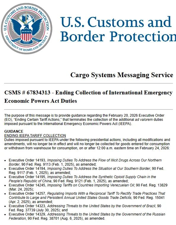 自2026年2月24日美国东部时间凌晨12:00起,停止征收依据《国际紧急经济权力法》(IEEPA)加征的全部进口关税。