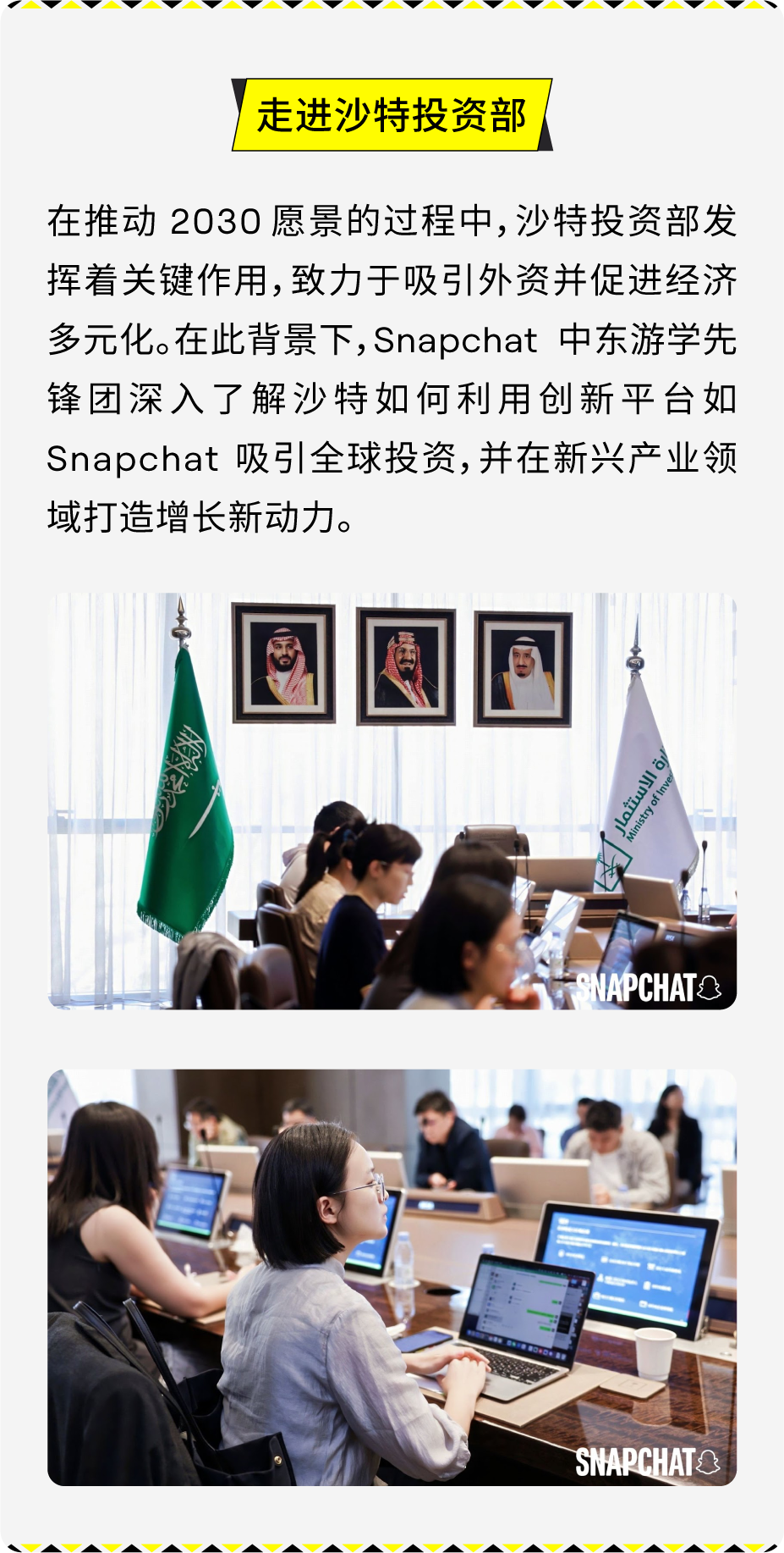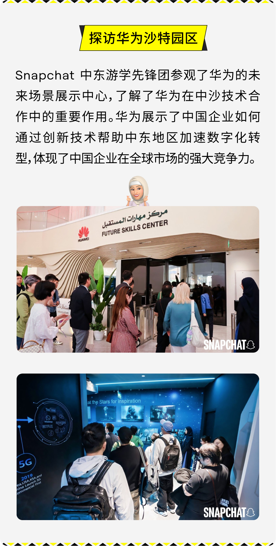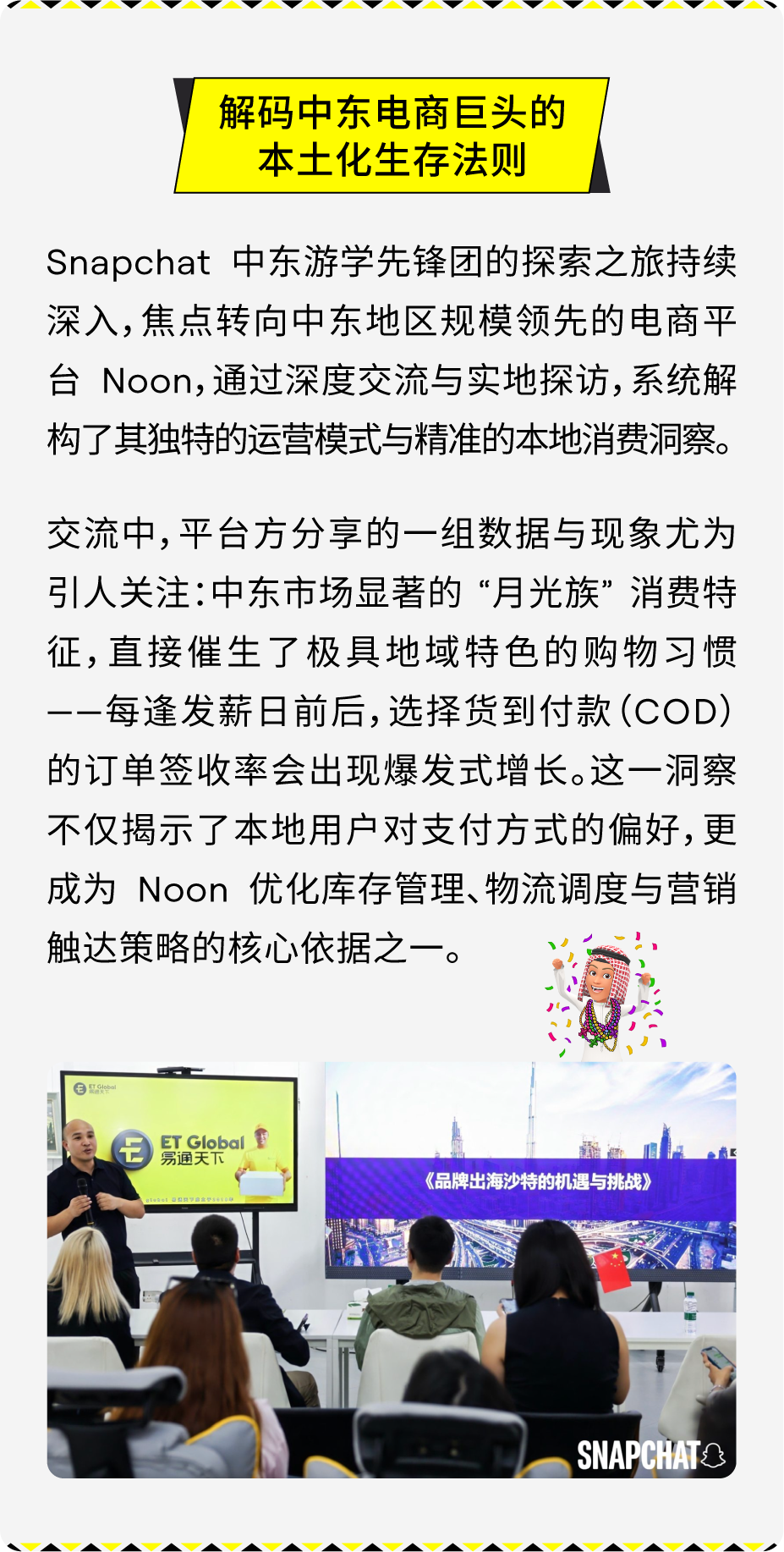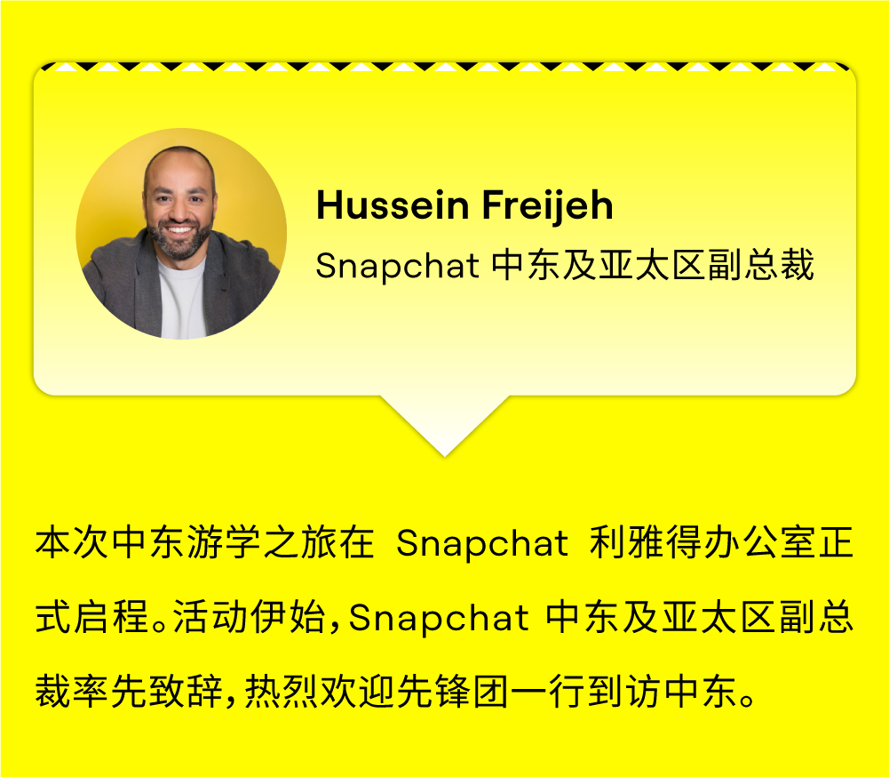 九月的利雅得,阳光炽热,正如中东市场所蕴含的无限机遇与活力。9 月 15 日,由 Snapchat 组织的中东游学先锋团一行出海品牌开拓者飞抵沙特阿拉伯首都利雅得,开启了为期三天的深度考察与交流之旅。本次活动聚焦于中东数字生态、本土市场洞察、投资环境及文化交流,为出海弄潮儿绘就了一幅中东市场的精准航海图。 Snapchat 月活用户超过 9 亿,覆盖 75% 的 13 -34 岁人群,每日产生 50 亿条 Snaps,且用户日均打开次数超过 30 次,高粘性互动为品牌触达提供了理想渠道。梁⾠重点介绍了全新 Sponsored Snaps 功能,广告主可以像好友一样直接触达用户聊天界面,实现深度互动,并结合生成式 AI 滤镜与 AR 特效,为用户打造沉浸式体验。同时,借助智能广告解决方案 Smart Campaign Solutions,品牌能够快速落地创意、优化投放效果,有效提升触达与转化。 Snapchat 中东游学的三天行程浓缩了从平台洞察、政策解读,到营商环境考察的完整图谱,为出海品牌描绘出清晰而鲜活的中东市场全景。此外,Snap 正式推出「中东加速计划」,将此次游学沉淀的洞察、策略与高端资源,转化为切实的品牌增长引擎。 Snap 已搭建好从市场进入、本地化合规到营销引爆的全链路支持体系,助力品牌将今日所见的蓝图,变为明日笃定的增长。欢迎联系 Snap 营销专家获取详情!