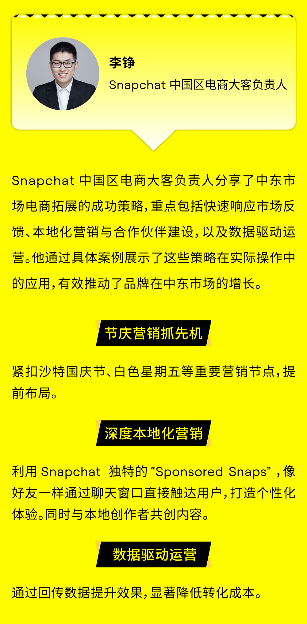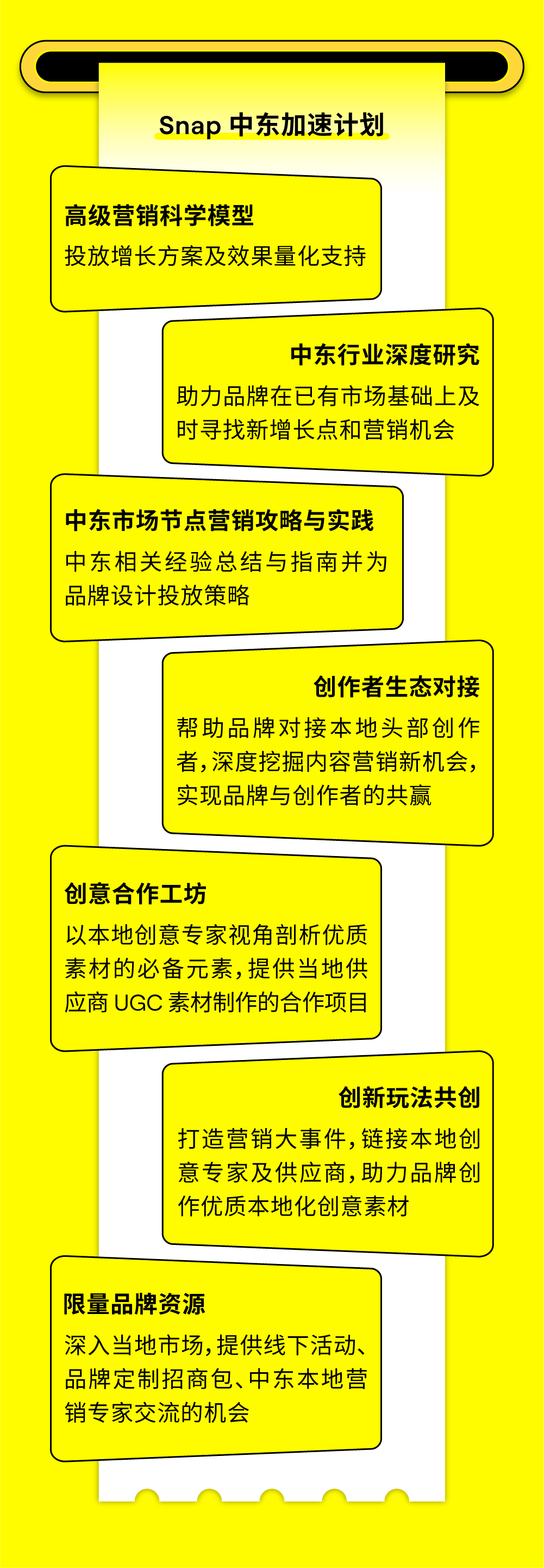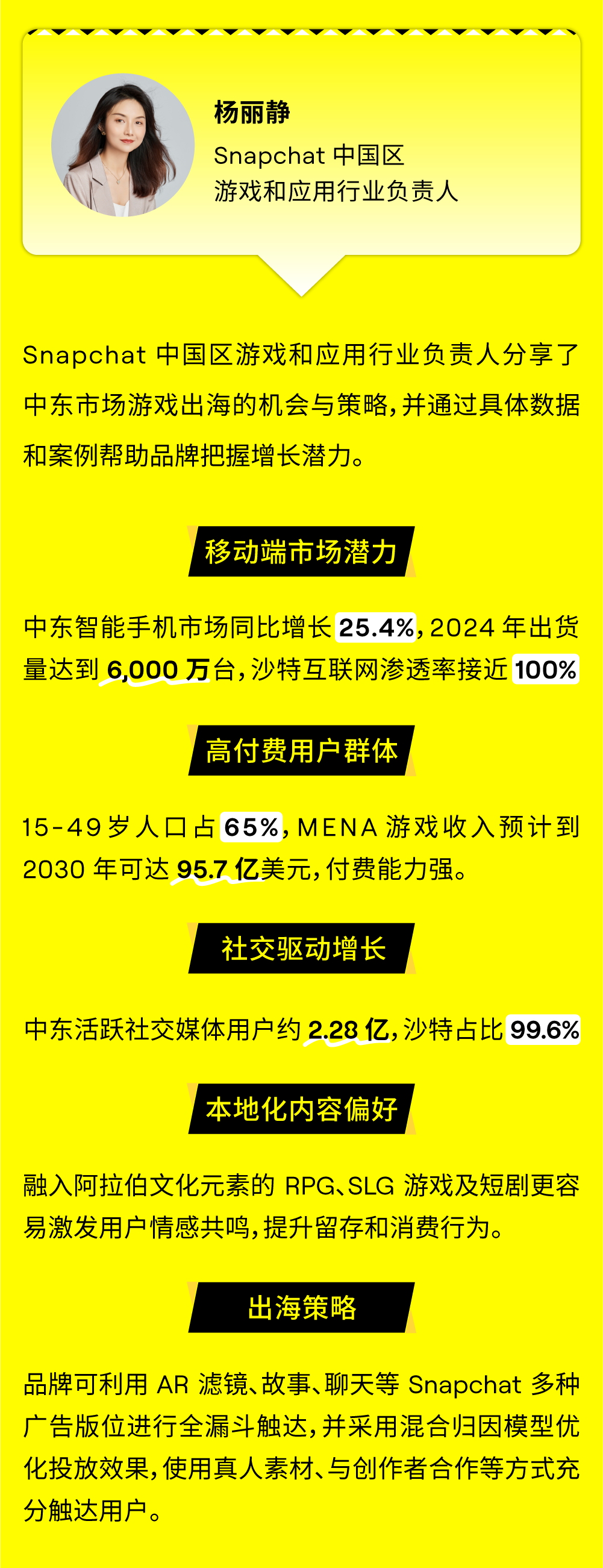 九月的利雅得,阳光炽热,正如中东市场所蕴含的无限机遇与活力。9 月 15 日,由 Snapchat 组织的中东游学先锋团一行出海品牌开拓者飞抵沙特阿拉伯首都利雅得,开启了为期三天的深度考察与交流之旅。本次活动聚焦于中东数字生态、本土市场洞察、投资环境及文化交流,为出海弄潮儿绘就了一幅中东市场的精准航海图。 Snapchat 月活用户超过 9 亿,覆盖 75% 的 13 -34 岁人群,每日产生 50 亿条 Snaps,且用户日均打开次数超过 30 次,高粘性互动为品牌触达提供了理想渠道。梁⾠重点介绍了全新 Sponsored Snaps 功能,广告主可以像好友一样直接触达用户聊天界面,实现深度互动,并结合生成式 AI 滤镜与 AR 特效,为用户打造沉浸式体验。同时,借助智能广告解决方案 Smart Campaign Solutions,品牌能够快速落地创意、优化投放效果,有效提升触达与转化。 Snapchat 中东游学的三天行程浓缩了从平台洞察、政策解读,到营商环境考察的完整图谱,为出海品牌描绘出清晰而鲜活的中东市场全景。此外,Snap 正式推出「中东加速计划」,将此次游学沉淀的洞察、策略与高端资源,转化为切实的品牌增长引擎。 Snap 已搭建好从市场进入、本地化合规到营销引爆的全链路支持体系,助力品牌将今日所见的蓝图,变为明日笃定的增长。欢迎联系 Snap 营销专家获取详情!