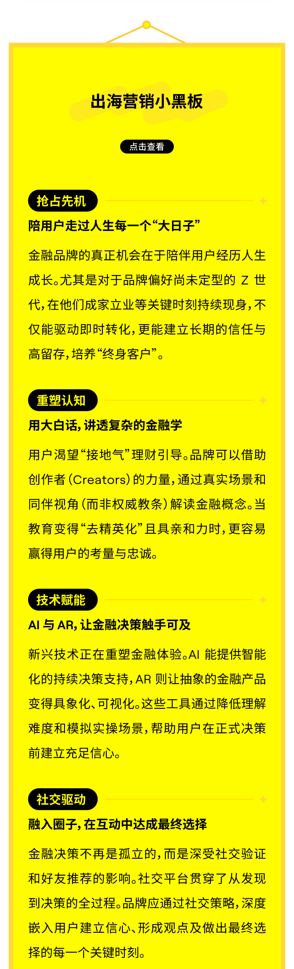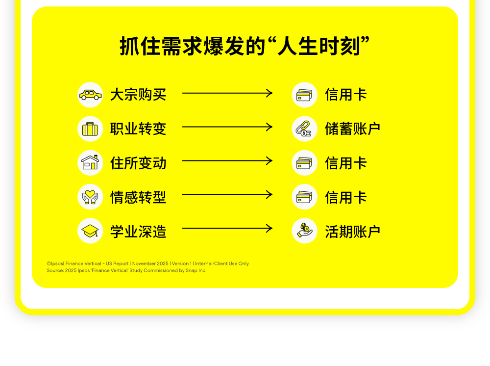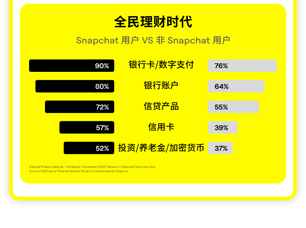 在传统的认知里,金融决策似乎总是与严肃的银行网点、复杂的 Excel 表格联系在一起。但现在的海外市场,风向变了。金融决策正发生在社交平台上。 全球领先的市场研究公司 Ipsos 对 1,100 名美国日常社交媒体用户进行了深度调研。 结果显示:金融的未来,不仅是数字化的,更是社交化的。 Snapchat 正以沉浸式互动体验为依托,成为金融品牌建立用户信任并缩短决策链路的最佳平台。 “财富新贵”已入场 但他们很迷茫 海外 18-44 岁的“下一代财富群体” 已经展现出了惊人的参与度: Gen Y 人均持有 5 个金融产品,而 Gen Z 正迅速缩小差距,人均持有 3.7 个产品。至少拥有一种金融产品(如信用卡或银行账户)的受访者占 Snapchat 日活用户在未来 6 个月内申请新金融产品的可能性是非 Snapchat 用户的 对许多年轻人而言,生活转变(如职业或家庭变化)是探索金融产品的主要催化剂。 更换或尝试全新金融产品的美国金融消费者在过去一年中经历了“人生大事” 的 Z 世代表示未来一年内将有“人生大事”发生 千禧一代在进行大宗购买(如购入新车)时更愿意探索新的金融产品 社交平台是金融课堂 的消费者认为他们需要更多理财教育(加密货币/养老金等) 的消费者表示会在社交平台学习金融理财知识 Snapchat 用户尝试新的金融产品的可能性是其他人的两倍 的 Snapchat 用户会向其他人推荐自己喜欢的金融产品 为什么金融品牌出海 必选 Snapchat?
