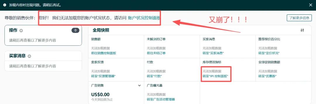 点击上面⭐星标,不错过任何一个跨境热点干货☝️ 这短短一个月内三次重大故障,让不少卖家心惊! ?10月20日“半个互联网停摆”事件 亚马逊卖家后台、订单系统、广告系统同步瘫痪。 ?10月31日,Listing大面积报错 持续四天的故障席卷美国站、欧洲站等核心站点,3C、家居、美妆等多个品类,卖家突遭遇“单位计数类型”报错,库存编辑页面功能失效,合规ASIN被无故限制甚至下架。 这系统故障直接导致卖家订单量急剧下滑,从日均300单骤降至40单,跌幅高达87%。 ?11月5日,美国站结账系统突发大规模宕机 ?11月7日,后台账户状态又崩了 这次故障集中在账户状态页面和自定义菜单,功能出现无法加载的故障,部分卖家持续1小时左右后台恢复,但仍有小部分卖家还未正常。 此次系统故障后出现的提示如下: 尊敬的销售伙伴:您好!我们无法加载您的账户状况状态。 加载内容时出现问题。请稍后再试。 很抱歉,该页面遇到突发异常大流量。请几分钟后重试。 这段时间的连环爆错,许多卖家猜测,亚马逊近段时间频繁出现的系统故障与平台裁员有关系? - end - 亚马逊新品推广的复盘思维 ?卖家精灵(全网最低价) 【标准高级VIP包年78折:SNOW78】 【单人版包年72折:SNOW72】 (续费、升级都可以用) 购买地址: https://www.sellersprite.com/cn/price ?优麦云(全网最低价) 【优麦云 4折专属折扣码:snow123】 购买地址:https://www.sellerspace.com/?utm=mgkjj ?Sif(全网最低价) 【Sif 88折专属折扣码:snow123】 购买地址:https://www.sif.com/ 新购、续费、增购、升级均适用— 1 —
