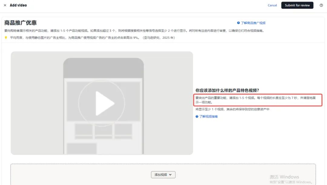 点击上面⭐星标,不错过任何一个跨境热点干货☝️ 这两天,不少卖家都陆续发现亚马逊广告的一则重大更新:后台的SP广告(商品推广)可以添加视频了! 当我们点进SP广告界面,在广告组可以看到多了一个标注“全新”视频广告位,卖家可以上传添加商品功能视频! 新功能有什么好处? 在前台展示时,系统会依据用户搜索查询和浏览历史,智能推荐最多3个视频缩略图。 视频满足50%以上屏幕可见时自动播放,买家可点击视频下方导航点,直接跳转至目标功能片段,大幅提升购物决策效率。 此外,广告能够专门针对视频广告位进行出价调整,来提高视频广告的展示机会。 数据表明,观看视频超5秒的买家,点击率提升8倍,可见,新功能将对产品的点击率和转化率有明显的提升! 那么卖家如何使用该功能? 卖家可以直接嵌入到现有 SP 广告中,无需新建广告组或广告系列。 上传视频时需注意格式: 商品功能标题(必填):最多3个词,不超过15个字符,作视频内容的标题展示、简洁易懂 描述(选填):最多6个词,不超过55个字符, 视频文件:为MP4或MOV格式,画面中商品占比需达50% 及以上,建议展示商品使用场景。 避免出现:画面模糊、幻灯片式播放、上下黑边、明显品牌标识(商品本身自带除外)、表情符号、裸体及任何音频。 单个ASIN的单段视频标签格式:按时间节点标注功能,拍摄光线、天气条件需一致,避免转场生硬。 单个ASIN的多段视频标签格式:文件名需包含标签与ASIN(如ASIN 1,商品实际使用场景;ASIN 2,防水。) 同时,要注意几个要求: 1.视频时长不低于7秒,平台会根据广告位、用户意图等自动剪辑核心片段(比如2分钟可能被剪为30秒); 2.单个商品最多可上传5段视频,每次广告至少展示2段;若上传超3段,亚马逊会按搜索相关性筛选展示。 3.视频审批流程需要48~72小时,通过就投放。 现在,卖家若想要抓住这波广告红利,尽快检查后台权限,准备合规的功能视频,利用现有SP广告直接嵌入,提升点击率与转化率。 - end - 亚马逊新品最强推广计划方案 ?卖家精灵(全网最低价) 【标准高级VIP包年78折:SNOW78】 【单人版包年72折:SNOW72】 (续费、升级都可以用) 购买地址: https://www.sellersprite.com/cn/price ?优麦云(全网最低价) 【优麦云 4折专属折扣码:snow123】 购买地址:https://www.sellerspace.com/?utm=mgkjj ?Sif(全网最低价) 【Sif 88折专属折扣码:snow123】 购买地址:https://www.sif.com/ 新购、续费、增购、升级均适用— 1 —