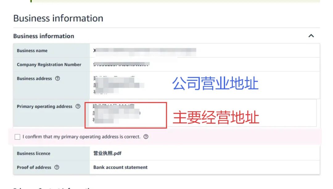 进入卖家后台「身份信息页面」,找到「Primary operating address」(主要营业地址)字段。