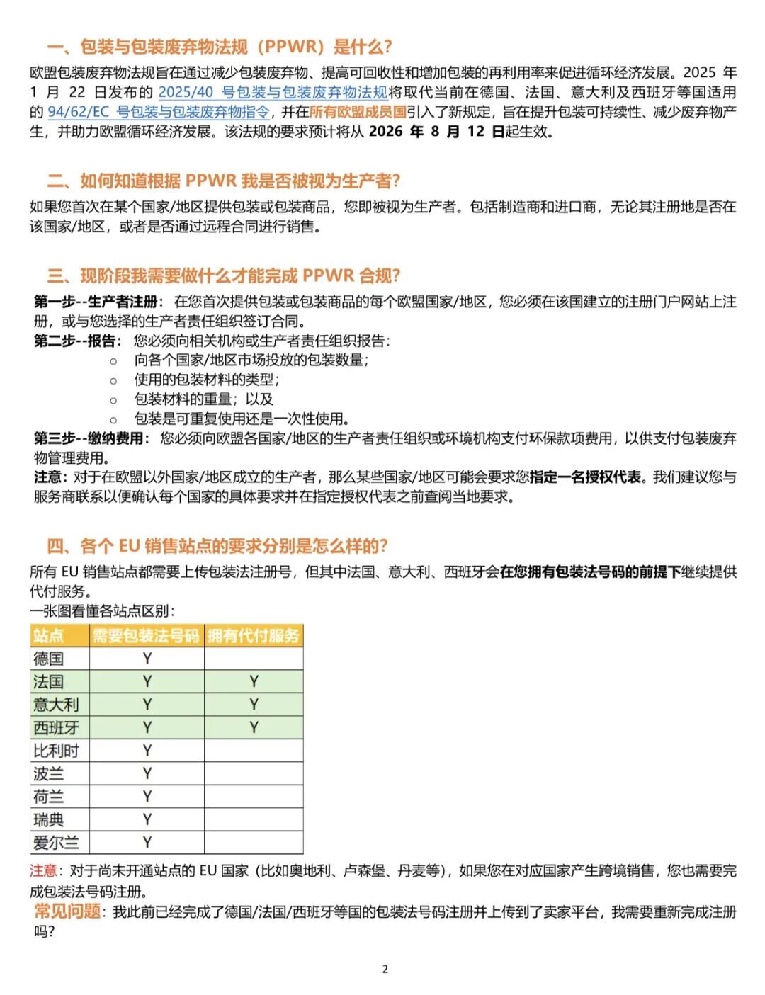 点击雪球站外关注>>免费领取>>站外电子书2.0 距离2026年8月12日欧盟包装和包装废弃物法规(PPWR)生效已不足半年时间。 这项将取代沿用近30年旧法规的新规,堪称“欧盟史上最严包装法”。 PPWR并非普通环保指令,而是一项全新的、具有法律约束力的欧盟“法规”,几乎覆盖所有带包装的商品,新规将于 2026年8月12日 起生效。 如果在截止日期前未能完成PPWR合规,根据国家/地区的不同,卖家将面临以下影响: ❌停售不合规商品:亚马逊等平台将直接下架相关卖家的Listing,导致销售中断。 ❌巨额罚款:部分国家/地区对违规行为处罚力度大,罚款最高可达企业年营收的6%。 ❌失去泛欧权益:对于参与泛欧计划(Pan-EU)的卖家,如果德、法、意、西、荷这五个国家的PPWR合规任一缺失,受影响的产品除面临停售外,还将失去Pan-EU权益。 据法规及平台要求,强制合规的国家有: 德国、瑞典、波兰、荷兰、爱尔兰、法国、西班牙、比利时、意大利。各国要求核心点如下: 法国:卖家必须在法国的回收计划中注册,获取唯一识别号(UIN)。包装上必须印刷有Triman标志及回收说明。 西班牙:境外企业注册必须指定本地授权代表代办。在注册完成后,需合规粘贴对应包装标签,并按时完成包装数据申报。 意大利:所有投放意大利市场的包装必须标注材料类型(如PET 01),并以意大利语标明分类收集方式。未贴标或未注册可能面临5,200至40,000欧元的罚款! 波兰:所有销售带包装商品的企业均需在波兰国家废物管理数据库(BDO)注册,获取唯一EPR编号。非波兰企业需指定本地授权代理人。 荷兰、爱尔兰、瑞典、比利时:这四国同样要求完成EPR注册并履行合规义务。由于部分国家注册时间长,建议卖家尽早安排。 值得注意的是:卖家必须在8月12日前完成目的国EPR注册,个别国家的注册时效要3-5个月,所以卖家越早安排越稳妥。 1️⃣立即自查与梳理 明确你在哪些欧盟国家销售,梳理这些站点所用包装的材料类型(销售包装、运输包装等)、重量和预估年销量,优先处理主要市场。 2️⃣完成EPR注册(新规后EPR注册更严了) 按照各国现有EPR注册体系一国一注册,非欧盟卖家必须指定欧盟授权代表(AR),准备相关材料(企业资质、包装信息、销售数据等),及时完成注册并获取注册号,定期申报缴纳回收费。 3️⃣布局优化包装设计 清点现有包装材料,判断哪些符合新规、哪些需要淘汰。提前规划库存清理和新包装采购。 如果置之不理会有哪些后果: PPWR是欧盟强制性法规,8月12日之后货物若在欧洲海关被查没有在当地完成EPR注册: 当前,欧盟PPWR新规强制实施已进入倒计时阶段。随着欧盟绿色监管的不断升级,EPR合规将直接决定产品能否进入欧盟市场。 建议跨境卖家尽快启动推进EPR注册流程,避免影响欧洲市场业务开展。 - end - 包装法规PPWR和新代付模式合规指南 ?卖家精灵(全网最低价) 【标准高级VIP包年78折:SNOW78】 【单人版包年72折:SNOW72】 (续费、升级都可以用) 购买地址: https://www.sellersprite.com/cn/price ?优麦云(全网最低价) 【优麦云 4折专属折扣码:snow123】 购买地址:https://www.sellerspace.com/?utm=mgkjj ?Sif(全网最低价) 【Sif 88折专属折扣码:snow123】 购买地址:https://www.sif.com/ 新购、续费、增购、升级均适用— 1 —