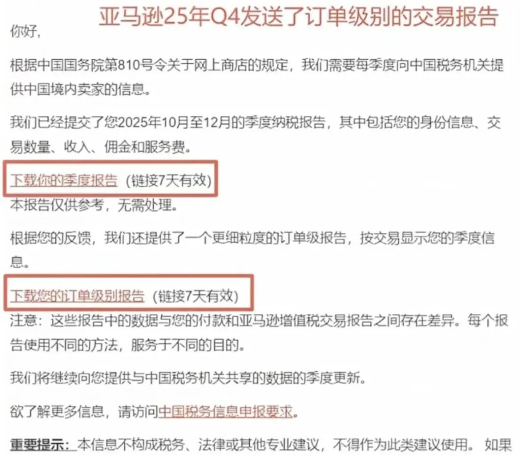 点击雪球站外关注>>免费领取>>站外电子书2.0 这两天,群里都炸锅了,用香港公司、美国公司注册的店铺,都收到了亚马逊Q4的税务数据推送。 “不是说境外主体不报送吗?” “我香港公司注册的店,今天早上收到邮件了。” 目前,不少亚马逊卖家都在忙一件事——对账。 在这次亚马逊推送的税务数据中,最核心变化是:不只报送国内主体,境外主体(香港、美国)也同步报送。 同时释放出两个非常关键的信号。 这次平台直接提供了更详细的数据,费用被一一详细拆开 包括但不限于:FBA配送费、广告费、销售佣金、仓储费、弃置费/ 清货费、入库配置费、优惠券费等,基本覆盖了卖家的核心成本结构等。 2.税务监管不看公司注册地,看背后的人。 现在,Q4数据明细可以下载了。 不过,有多店铺的卖家要注意,据做申诉的业内人士反馈。 不要在本地电脑上同时打开多个店铺的税务数据,更不要直接点邮件里的链接查看。 建议的做法是:直接在对应的运营工具里查看各店铺的税务数据,不要在本地浏览器直接点开亚马逊后台的链接。 此外,有很多卖家核对后发现,亚马逊报给税局的收入数字,和自己账上的不一样,有的偏差几万,有的超过十万。 原因可能是多方面: 但税局看到的,就是两个数字之间的差值。 现在建议卖家马上做: 1.抓紧对账 先把亚马逊报送数据和后台数据的差额来源搞清楚。(退款口径、汇率差、发货与收款时间差) 2.查推送主体 如果11月换了主体,推送会到新主体;12月才换的,还是会推到旧主体。两边都要确认。 3.看税务数据,走独立环境 不要在本地电脑跨店操作,可以借助紫鸟这类工具查看,别踩强关联这个坑。 4.整理好各种凭证 目前有消息说平台报送的海外支出将来可能允许无票成本扣除,静等政策发布。现在可以把支付单、对账记录先整理清楚。 - end - 低投入高回报的捡漏广告打法 ?卖家精灵(全网最低价) 【标准高级VIP包年78折:SNOW78】 【单人版包年72折:SNOW72】 (续费、升级都可以用) 购买地址: https://www.sellersprite.com/cn/price ?优麦云(全网最低价) 【优麦云 4折专属折扣码:snow123】 购买地址:https://www.sellerspace.com/?utm=mgkjj ?Sif(全网最低价) 【Sif 88折专属折扣码:snow123】 购买地址:https://www.sif.com/ 新购、续费、增购、升级均适用— 1 —