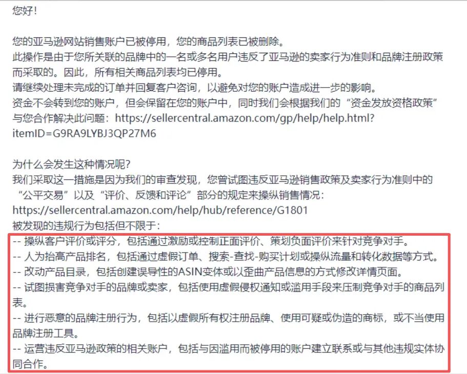 邮件中提及了6点违规行为,包括操纵评论、人为提升产品排名、篡改产品目录、试图损害竞争对手、滥用品牌注册和违反亚马逊政策。