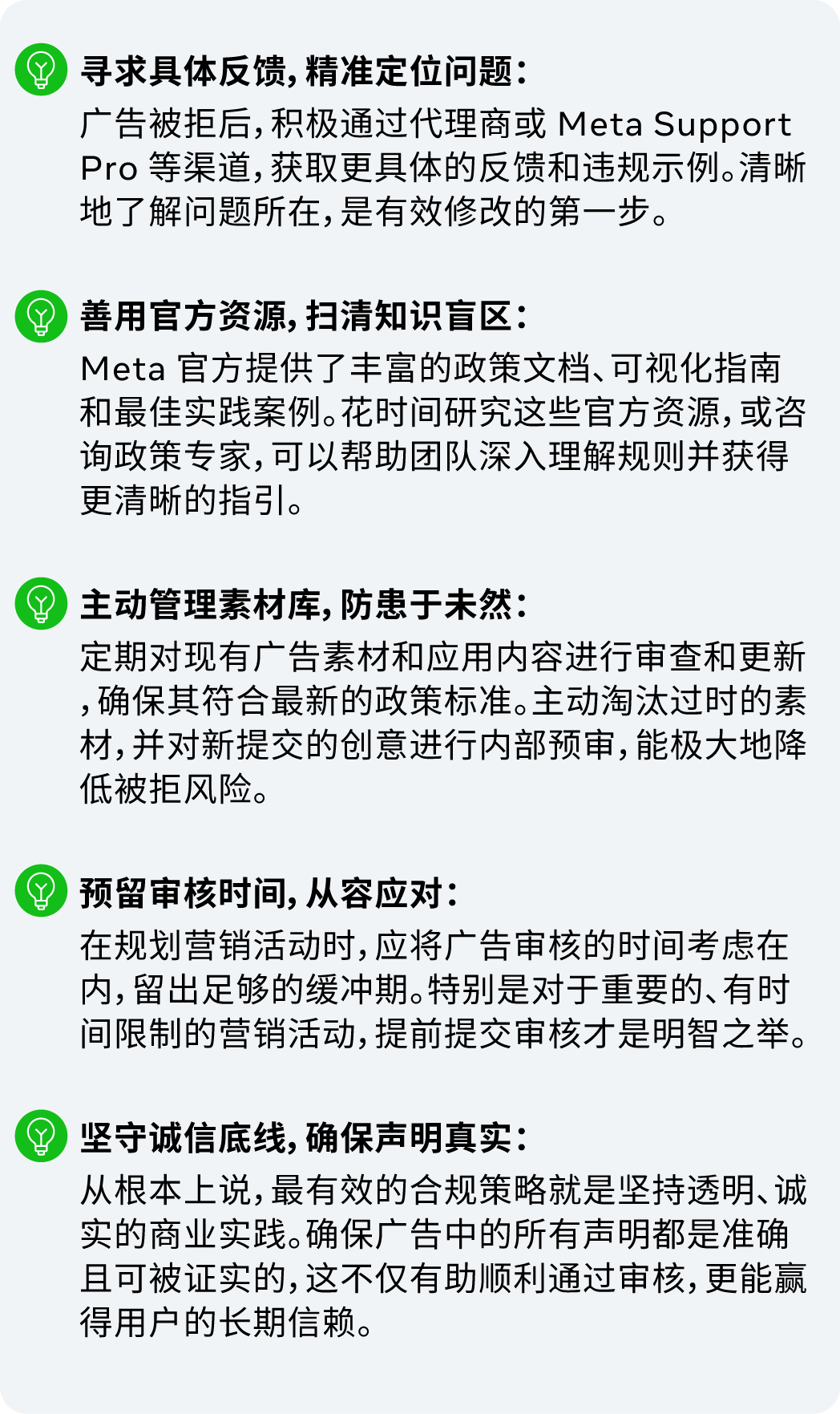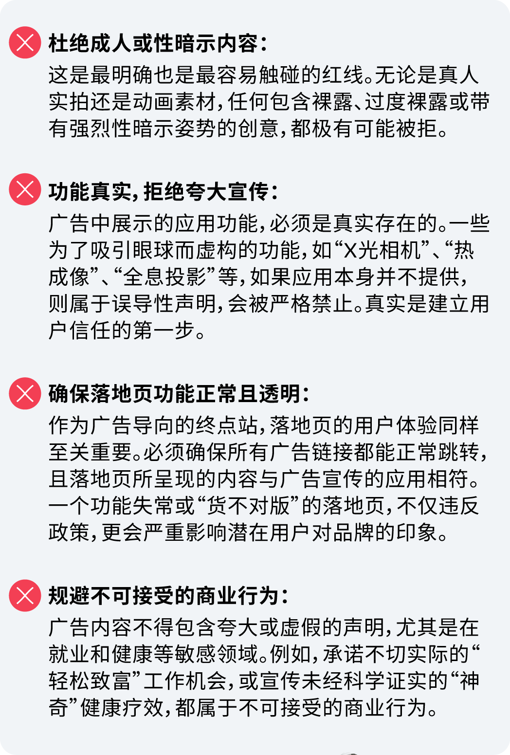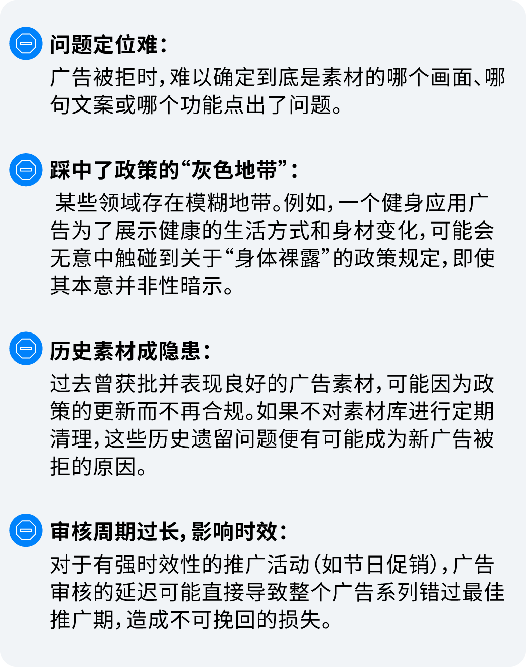 精心策划的广告,在上线前夕被一纸“广告被拒”打回原形,该怎么办? 当广告投放的引擎因审核而熄火,增长的脚步便会停滞。其实,广告政策并非增长的“绊脚石”,而是保障用户体验、建立品牌信任的“安全网”。了解并遵守这些规则,是实现长期、可持续增长的基础。 当广告被拒时,与其盲目修改,不如先对照以下四个最常见的政策“高压线”进行自查,这往往能解决大部分问题。 即便了解了基本规则,广告主在实践中仍会遇到各种挑战,让合规之路充满不确定性。我们总结了应用出海广告主常面临的挑战: 面对这些挑战,与其每次被动地等待审核结果,不如建立一套主动、高效的合规管理流程。
