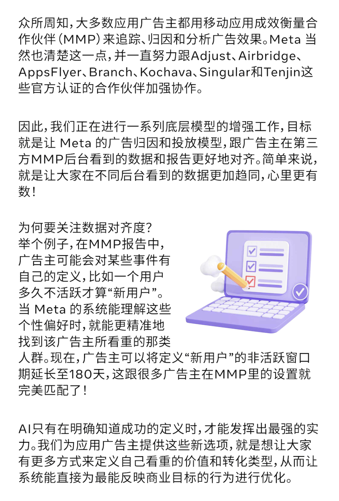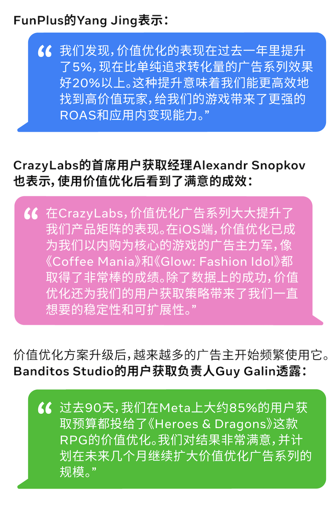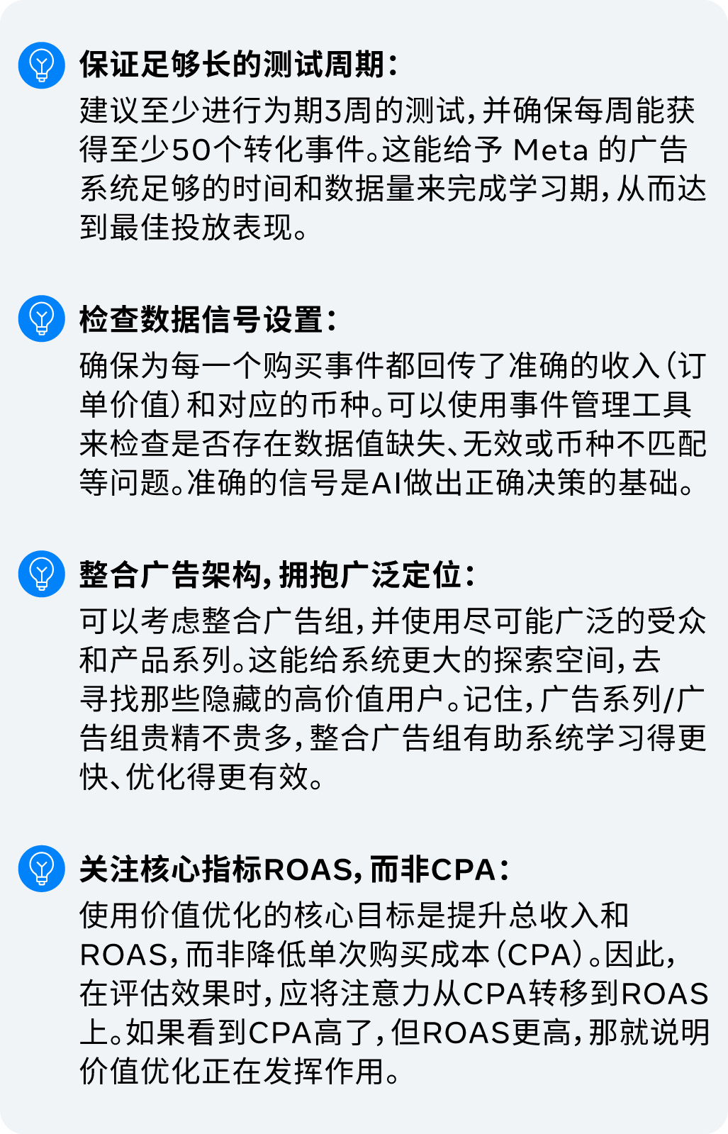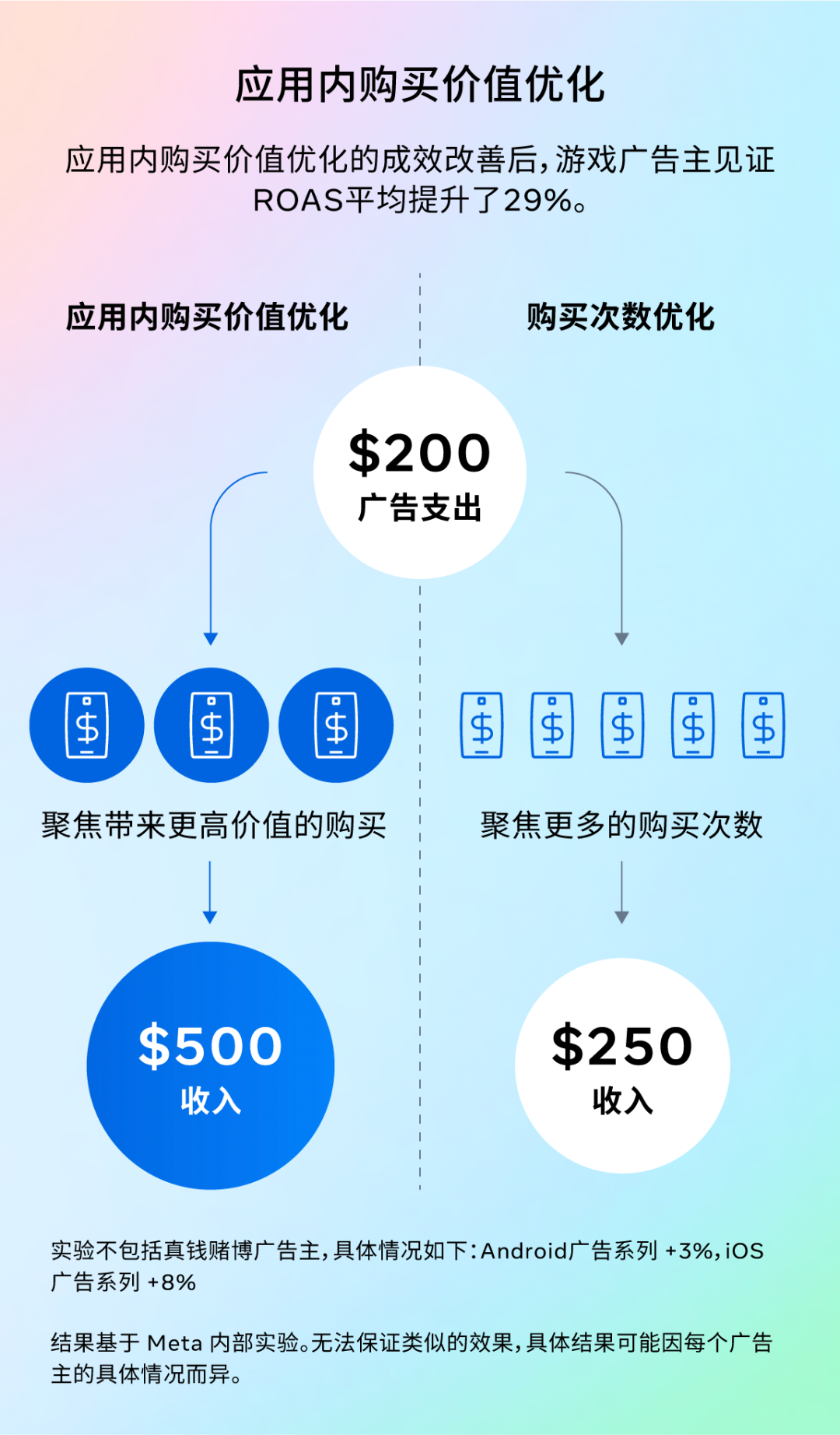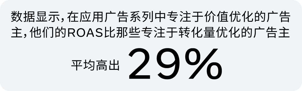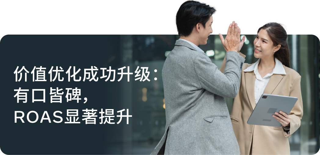 对于做应用和游戏出海的广告主来说,大家的目标各有千秋:有的希望尽可能多地获取应用下载,有的想专注于提升应用内购买的次数,还有的则把广告支出回报率(ROAS)奉为圭臬。总之,每个企业对成功的定义都不一样。在当下这个AI驱动的数字广告大潮中,我们的目标是让广告主拥有更精准的掌控力,引导AI朝着对他们最重要的业务结果去努力。 针对重视应用内购买的广告主, 在过去一年中,Meta 一直在默默升级模型,如今,转化价值最大化这一解决方案的表现比从前更为亮眼。 光有数据还不够,这一提升也得到了众多头部广告主的盖章认证。 有些广告主在尝试价值优化时,可能没能立刻看到想要的效果,这可能跟设置和策略有关。尝试以下最佳实践,让价值优化“火力全开”: Meta 的价值优化产品在此轮成功升级后,能更智能地帮助应用和游戏广告主分配预算,实现更高的回报。它能帮助出海广告主从单纯的“买量”升级到智慧的“买价值”,迈出实现可持续增长的关键一步。通过这一工具,广告主可实现: