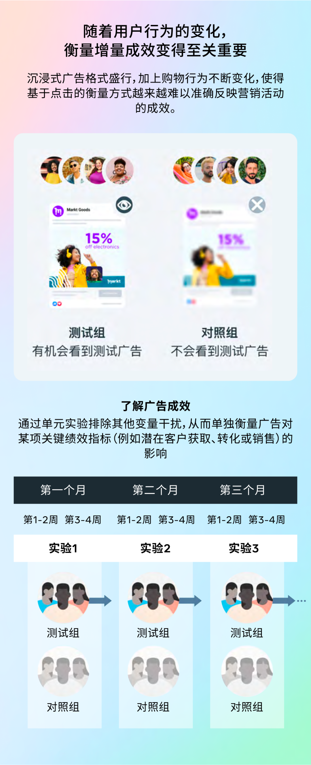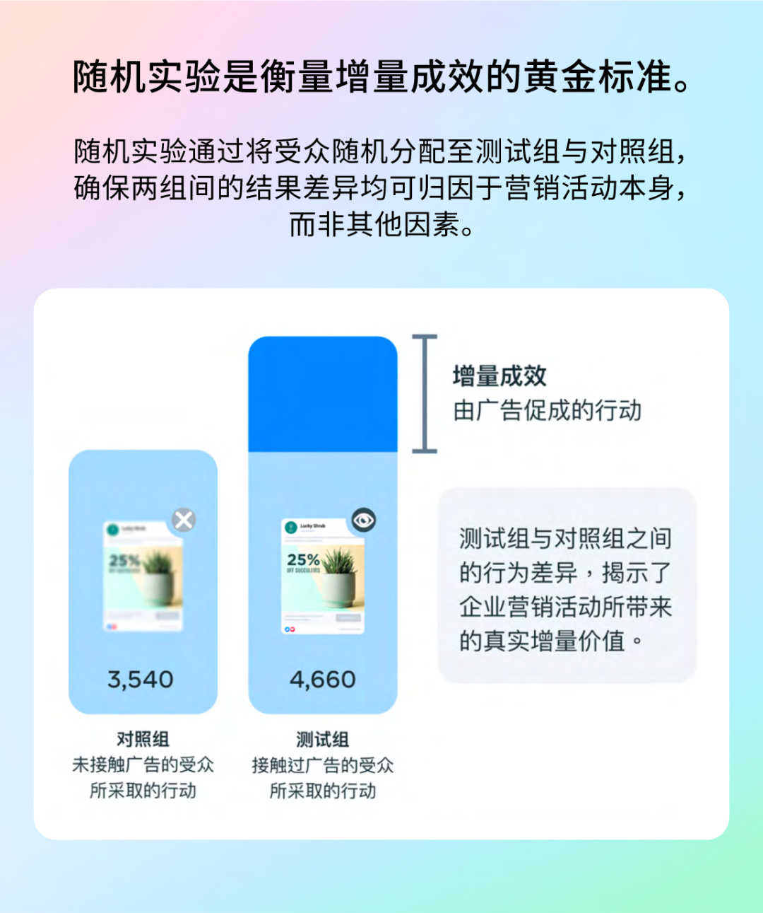 这是一种严谨的科学实验方法。系统会将目标受众随机分为两组:一组看到广告(测试组),另一组不看广告(对照组)。通过比较两组的转化差异,就能精确计算出广告带来的净增量。