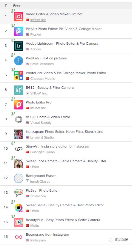 看了下最新的排行榜,除了前几个照片和视频编辑app,我们的出海巨头美颜相机也在前20位。