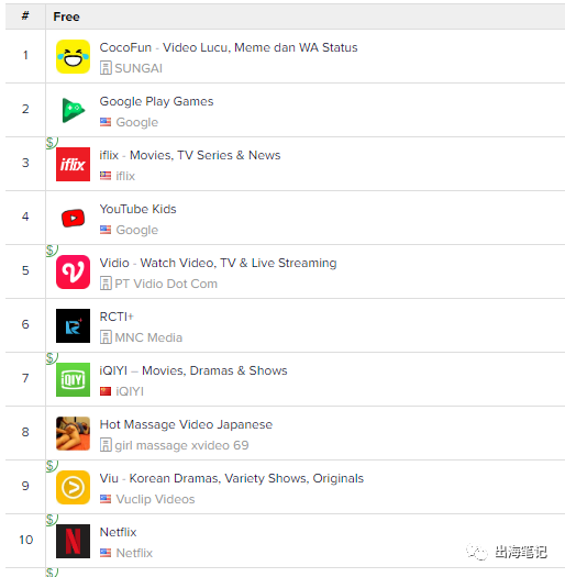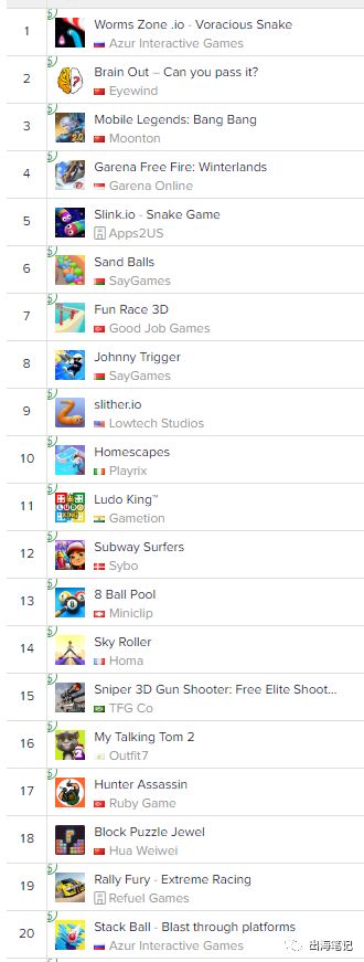 来自上海沐瞳科技的出海手游无尽对决(Mobile Legends类似王者荣耀的MOBA),最新排名第三,看来全世界都一样,MOBA类型确实很火。