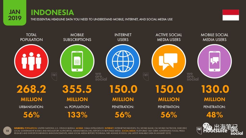 根据We Are Social发布的2019年全球数字生态系统年度报告,印尼有1.5亿活跃网民,同比增长4.70%。预计2020年将成为按用户数量计算的第四大互联网市场。这意味着普及率为56%的人口。