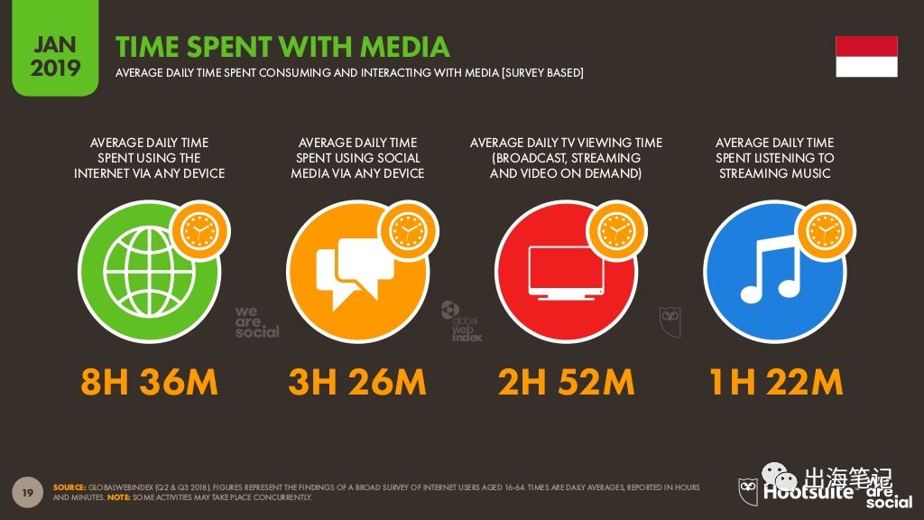 印尼人在互联网上非常活跃,在We Are Social报告中,79%的调查受访者表示,他们每天至少登录一次网络。平均每天上网时间为8小时36分钟,其中约5小时用于社交媒体和流媒体音乐。
