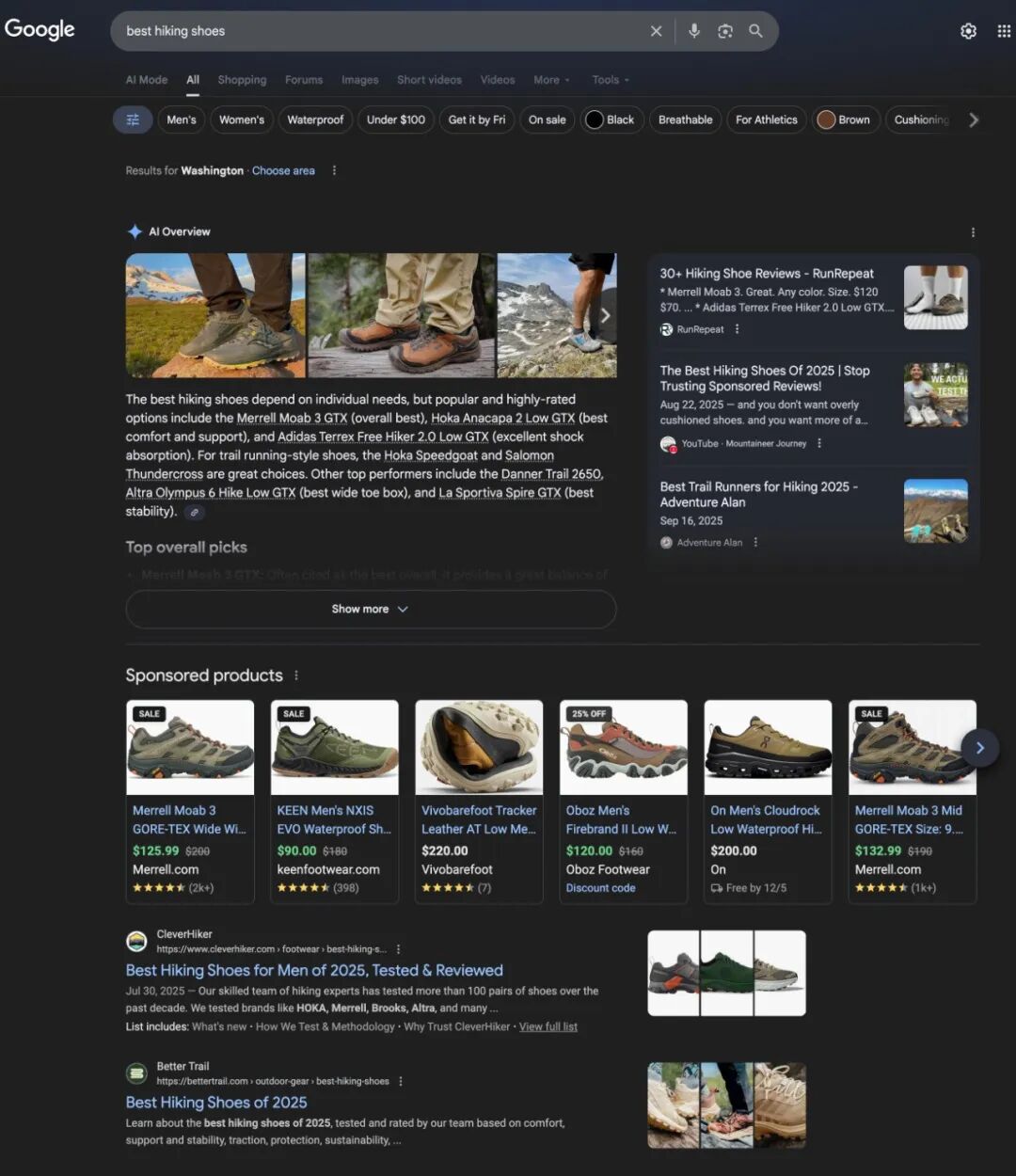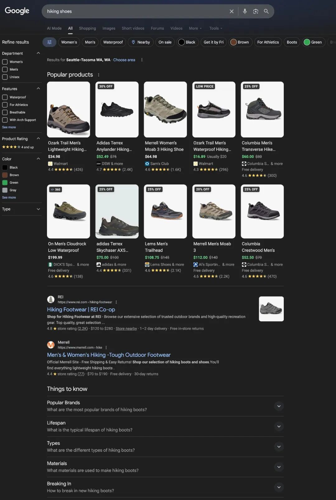 Google Search Console (以下简称 GSC)新上线了 2 个新功能:自定义注释、品牌搜索筛选。 官方介绍文档: 《自定义注释》 https://developers.google.com/search/blog/2025/11/custom-chart-annotations 《品牌搜索筛选》 https://developers.google.com/search/blog/2025/11/search-console-branded-filter Vincent Terrasi 获得了一份 OpenAI 的机密文件,其中的数据显示:ChatGPT 的链接点击率非常低。 点击数据大概是这样的: 链接出现的位置也很有意思。曝光度最高的区域,反而是点击率最少的。 这对 SEO 和 GEO 来讲非常关键。这说明: 原文链接:https://www.linkedin.com/feed/update/urn:li:activity:7396255188509986816/ 这是微软 Bing 搜索的官方博文,也正好是上一个问题的答案,主要分享 AI 搜索(如 Microsoft Copilot )如何彻底改变用户决策路径及营销衡量标准,对 Google、ChatGPT、Perplexity 也同样适用。 洞察:用户营销旅程的“上游化” 结论:质量胜过数量 建议:为 AI 优化,而非仅为点击优化 原文链接:https://blogs.bing.com/webmaster/November-2025/How-AI-Search-Is-Changing%E2%80%AFthe%E2%80%AFWay%E2%80%AFConversions%E2%80%AFare-Measured AI 搜索跟传统搜索不同,不再是10条蓝色链接,而是有产品模块、AI概览的信息模块、Reddit 的 UGC 模块等。 这里有 2 个 SEO 技巧:第一个是原始关键词的扩展,可将其拓展为: 这几种都是转化较高,符合用户搜索习惯的关键词,也对应了不同的用户意图。 其次,可以结合对应的 Google 搜索结果,来分析用户意图,并补充类目页的内容。 比如 “Best hiking shoes” 在 Google 搜索结果(如下图)中先展示了 AI概览,其次是一些导购文章(包含了产品评测、推荐、用户评价等),然后是一些热门产品,所以这个关键词背后的用户需求是产品评测、推荐、用户评价等。如果想获得这个关键词的排名,就需要针对性的部署这些内容。 产品页优化的 5 个步骤: 优化首屏文案:不要只写一句废话。要说明背景信息,说明这个分类页是什么产品、适合哪些用户 增加 FAQ 部分:在分类页底部增加常见问题解答(FAQ)。这是 AI 搜索最容易抓取和引用的内容来源 明确提及实体:AI 依靠“实体词”来理解网页,你的文案不能只说“我们要卖夹克”,而必须明确提及相关的实体词: 部署结构化数据:告诉 AI 页面上有什么,方便 AI 分析和理解 文案优化实战对比 原文链接:https://www.womenintechseo.com/knowledge/boost-category-pages-ai-visibility%20/ Moz 的《2026 年 SEO 趋势:20 位行业专家的预测》 https://moz.com/blog/2026-seo-trends-predictions-from-20-experts 《使用 Chrome DevTools MCP 审核 Web 核心指标》 https://sitebulb.com/resources/guides/auditing-core-web-vitals-with-chrome-devtools-mcp/ 附注