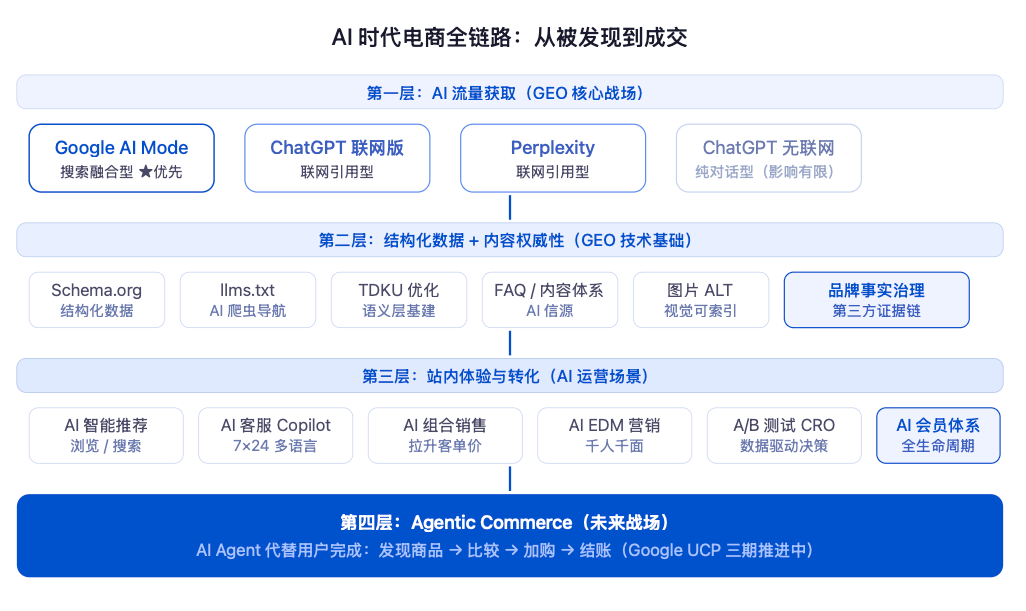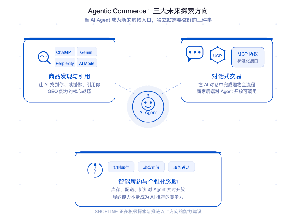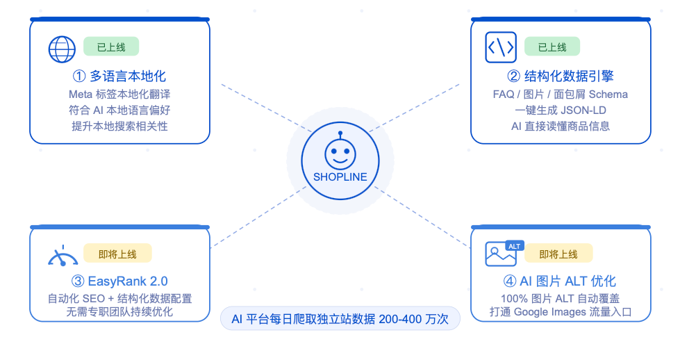 引言: 一场正在发生的流量入口结构性迁移 ?大洋彼岸,一个美国消费者打开 ChatGPT,输入「推荐一款续航超过 20 小时的降噪耳机」——他没有打开 Google,没有点击任何一个独立站,但 30 秒后,他已经有了购买决策,并跟随 AI 的推荐完成了下单。 这个场景,正在当下以每天数百万次的规模发生,并且以可观的速度持续高速增长。 过去十年,跨境卖家习惯了一套固定的流量逻辑:做好 Google SEO、投好 Facebook 广告、运营好社媒内容——只要流量进来,独立站就能承接转化。但从 2025 年开始,一个新变量正在悄然改变这套逻辑的底层规则。 ChatGPT、Gemini、Perplexity 这些 AI 工具,正在从「更高效的搜索方式」演变为「购物决策的新入口」。当消费者开始习惯向 AI 问「适合夏天海边度假的连衣裙推荐」,他们不再需要打开搜索引擎、逐条点开链接、反复比较,因为 AI 已经替他们完成了筛选和决策。 AI 对话框是否会取代传统搜索引擎的讨论或许不会在短时间内就尘埃落定,但摆在无数商家面前最紧迫的问题在于,当越来越多用户开始习惯用 AI 帮助自己做购物选择的这个全新游戏规则下,你的品牌在不在游戏邀请名单之列? 这些数字背后,是流量入口的结构性迁移,种种迹象表明,一场影响深远的布局机会,正处于认知变革与规则重置的核心窗口期。 ?SHOPLINE 市场洞察: AI 流量占比尚小,但杠杆效应已经显现 在过去三个月里, ChatGPT 带来的独立站访客平均占比约 0.04 %,绝对量看似微小,但其转化率已比全站整体水平高出约 14 % ——这说明 AI 导流的用户是「带着目的来的」,意向明确,转化质量高。 更值得关注的是,ChatGPT 计划于 2026 年推出广告模式,届时 AI 流量的商业化将全面提速。 其他主流 AI 平台也不容忽视,Gemini 流量持续增长,版本更新后增速斜率已超 ChatGPT。 现在入场,是低成本占位;等流量规模爆发后再优化,成本将大幅上升。 01: GEO 是什么,它与 SEO 有何不同? 从关键词到对话,信息搜素与获取的底层逻辑重置 传统 SEO 的游戏规则是:写对关键词 → 获得排名 → 用户点击链接进站,核心逻辑是「赢得算法的信任」。但 GEO(Generative Engine Optimization,生成式引擎优化)针对的是一套完全不同的机制,AI 对话框不再「列举链接」,而是「生成答案」。在这个过程中,AI 会主动抓取、理解、引用它认为最权威、结构最清晰的内容。这中间的关键变量——AI 的理解与判断,则来自于三个要素:结构化程度、内容权威性、语义清晰度。 面对眼花缭乱的 AI 工具,商家首先需要建立清晰的全局视图。 搜索融合(Google AI Mode、AI Overview):传统搜索 + AI 总结,SEO 基础与GEO 优化双重发力,这是当前跨境卖家最应优先布局的核心入口 AI 大模型(ChatGPT、Perplexity、Claude):AI 实时抓取 ,标注引用来源,GEO 直接影响引用率,是长期内容权威性建设的重要阵地 ? SHOPLINE品类洞察: 不同品类的消费者在 AI 中的「问法」也截然不同 服装消费者:「我腰围 70cm 应该选什么码?」「这件外套是修身款还是宽松款?」 关键字段:尺码表、版型描述、模特身高体重 美妆消费者:「油痘肌能用这款精华吗?」「这款气垫是哑光还是水光妆效?」 关键字段:适用肤质、核心成分、Cruelty-free 认证 3C消费者:「这款产品支持哪些协议标准?」「这款氮化镓充电头多口并发时怎么分配功率?」 关键字段:规格参数精确值、协议标准、多场景实测数据 消费者在 AI 对话框中的提问通常是场景化、自然语言式的,而非关键词式的。商品页如果缺少这些字段,AI 就算想推荐,也无法组织出有说服力的答案。 02: SHOPLINE 四大核心能力 助力 GEO 精准布局 对于大多数跨境卖家而言,GEO 涉及的技术门槛并不低——从结构化数据到 AI 爬虫配置,从多语言本地化到内容规模化生产,每一项都需要专业能力支撑。这正是建站平台发挥规模化价值的核心场景。SHOPLINE 围绕 GEO 的四个关键技术支柱,正在持续推进能力建设: 多语言高保真本地化——保证多语言环境下的AI锁定准确度 AI 搜索引擎在为用户生成推荐时,会优先引用「符合当地语言习惯」的内容。生硬的机器翻译,不仅影响用户体验,也会降低 AI 引用的可能性。SHOPLINE 已上线「SEO/AEO 的 UGC 多语言可视化翻译」能力,支持将首页 Meta 标题、Meta 描述、Meta 关键词等核心字段,针对不同市场进行本地化翻译配置。这意味着当 Google 收录你的网站不同语言版本时,呈现的是真正「为本地用户而生」的原生内容——这对提升本地搜索相关性和 AI 引用率有直接价值 。 结构化数据引擎——构建 AI 索引友好的知识图谱 结构化数据(Schema.org / JSON-LD)是 GEO 的「地基」,因为 AI 搜索在返回答案时,更倾向于引用结构化程度高的页面。SHOPLINE 已支持 FAQ、商品图片/视频、面包屑导航等多类型结构化标记,这些数据的结构化不仅能帮助 AI 更准确地抓取站内商品的关键信息,提高 AI 收录率,同时也能让页面的排名和引用有直接提升。 EasyRank 2.0——从「手动配置」到「自动优化」 即使明白 GEO 的重要性,大多数卖家也缺乏专职 SEO 团队持续维护优化工作。SHOPLINE 即将全面升级上线的 EasyRank 2.0 正是为此而设计——通过自动化配置 + 强大的结构化数据能力 + 内置搜索最佳实践的产品化整合,让没有专业 SEO 团队的独立站商家,也能持续、轻松地获取高质量搜索流量。 图片 ALT 自动优化——把被忽视的流量入口补上 许多消费者的购