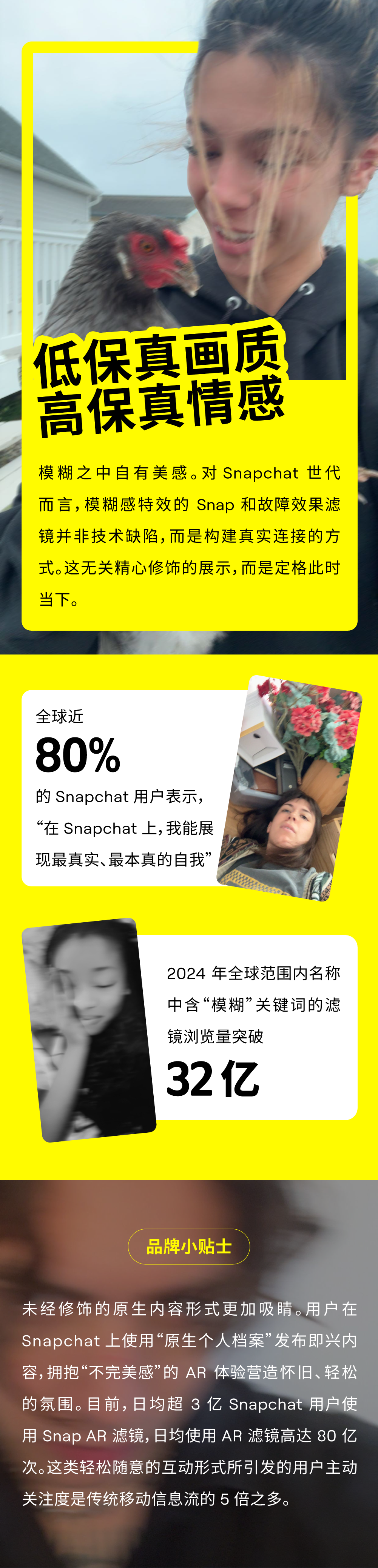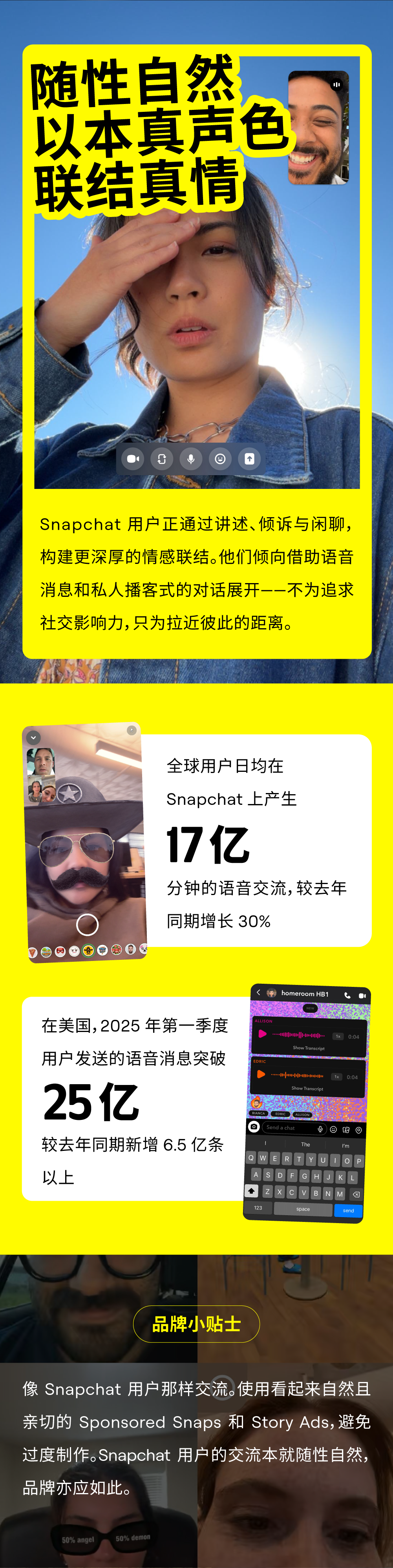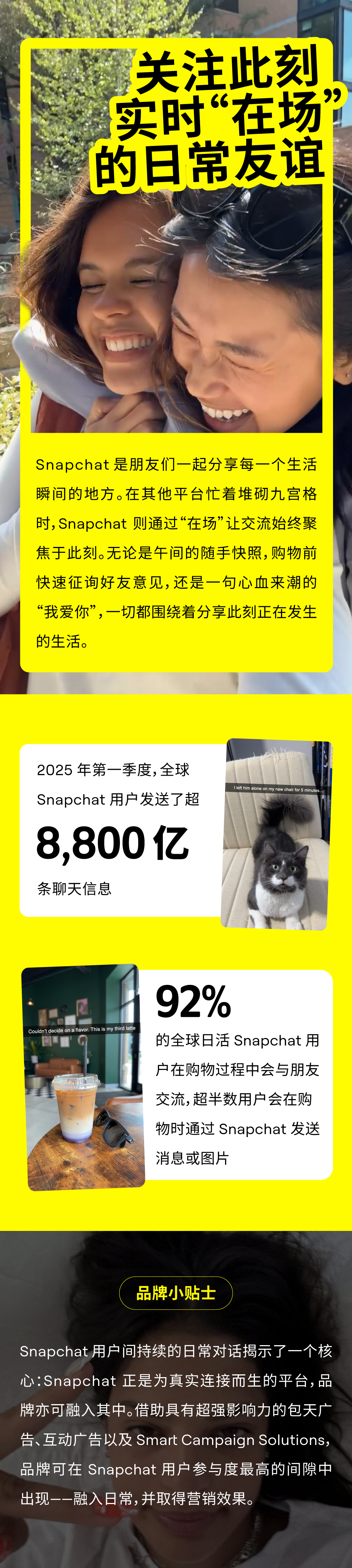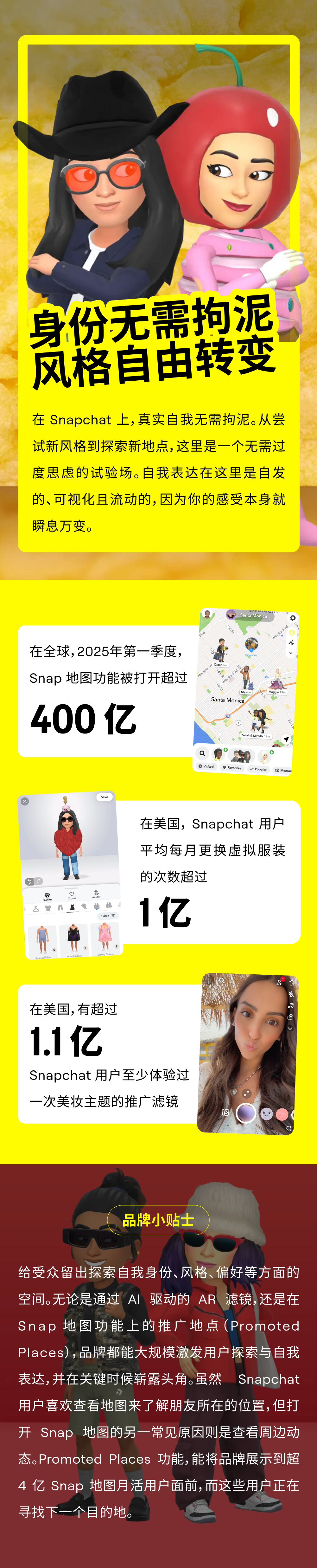 从低保真创意到实时连接,Snapchat 无疑是下一代展现真实自我的平台:无需美化、不断演变且深度参与。对于品牌而言,这里不仅是提升关注度的地方,更是与塑造文化、引领潮流的一代建立持久关联的重要阵地。