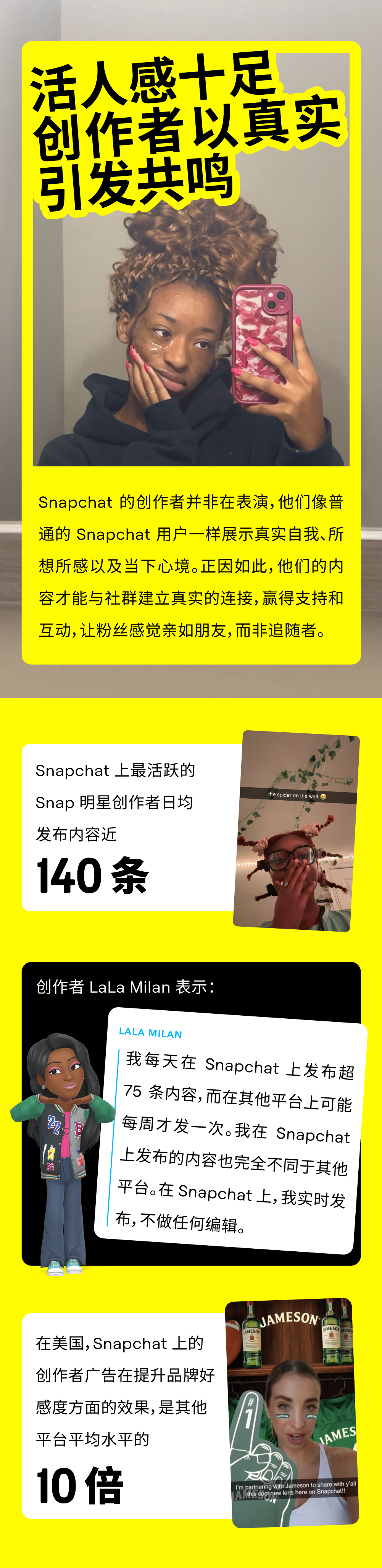 与那些像真实 Snapchat 用户一样使用该平台的创作者合作。最具影响力的创作者内容,应让用户感觉就像是朋友分享的日常,而非商业广告。通过 Snap 创作者合作平台(Snap Collab Studio)与创作者合作,打造即兴创作、原生态的内容,并赋予他们共同打造能引起其粉丝群体共鸣的原生体验。
