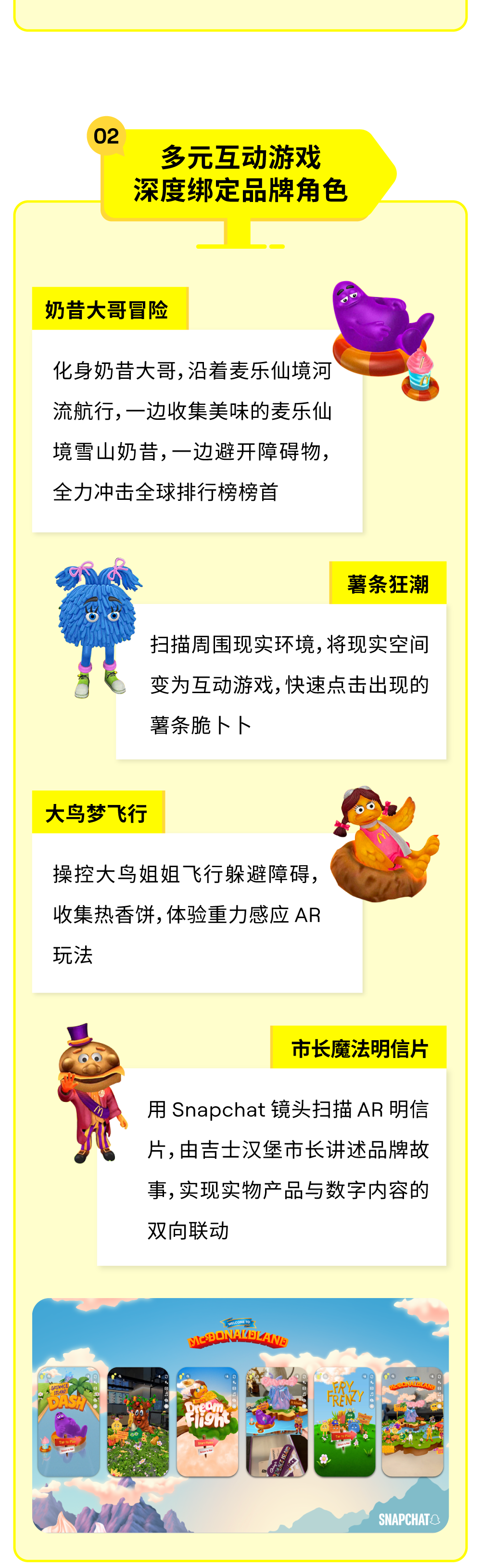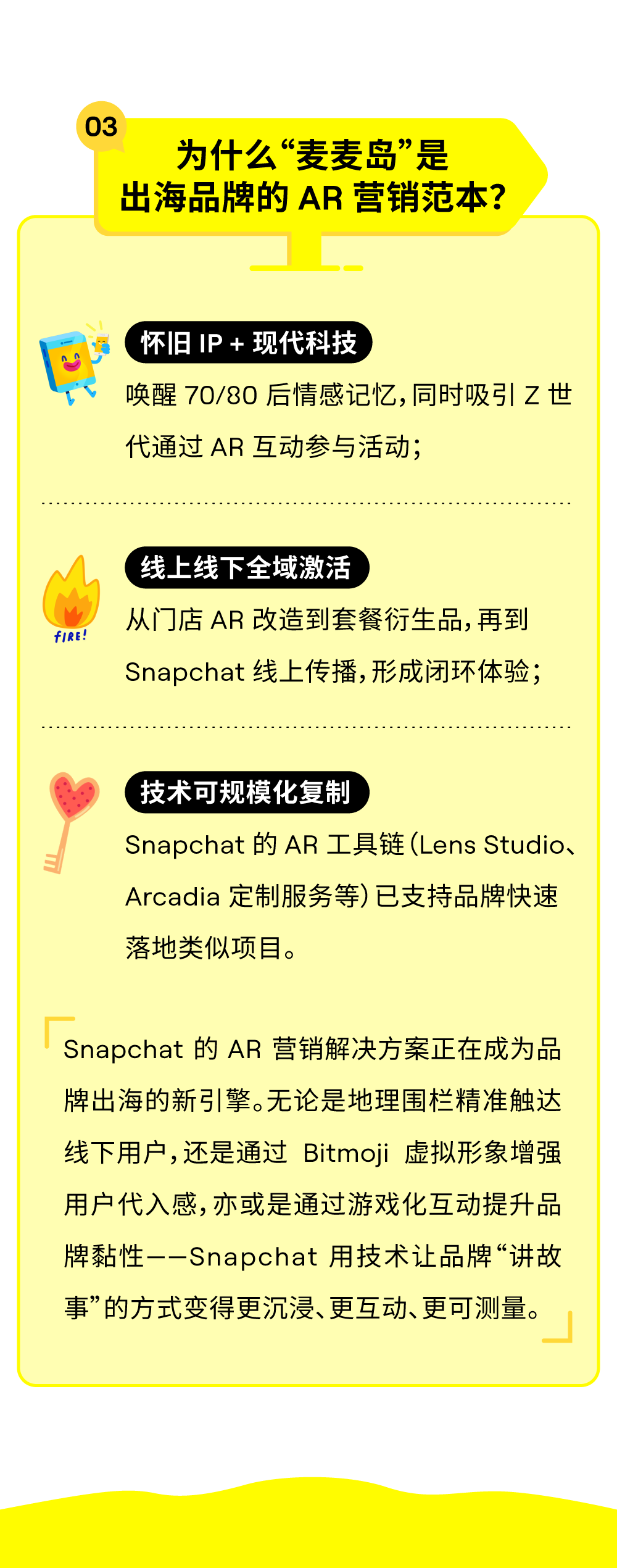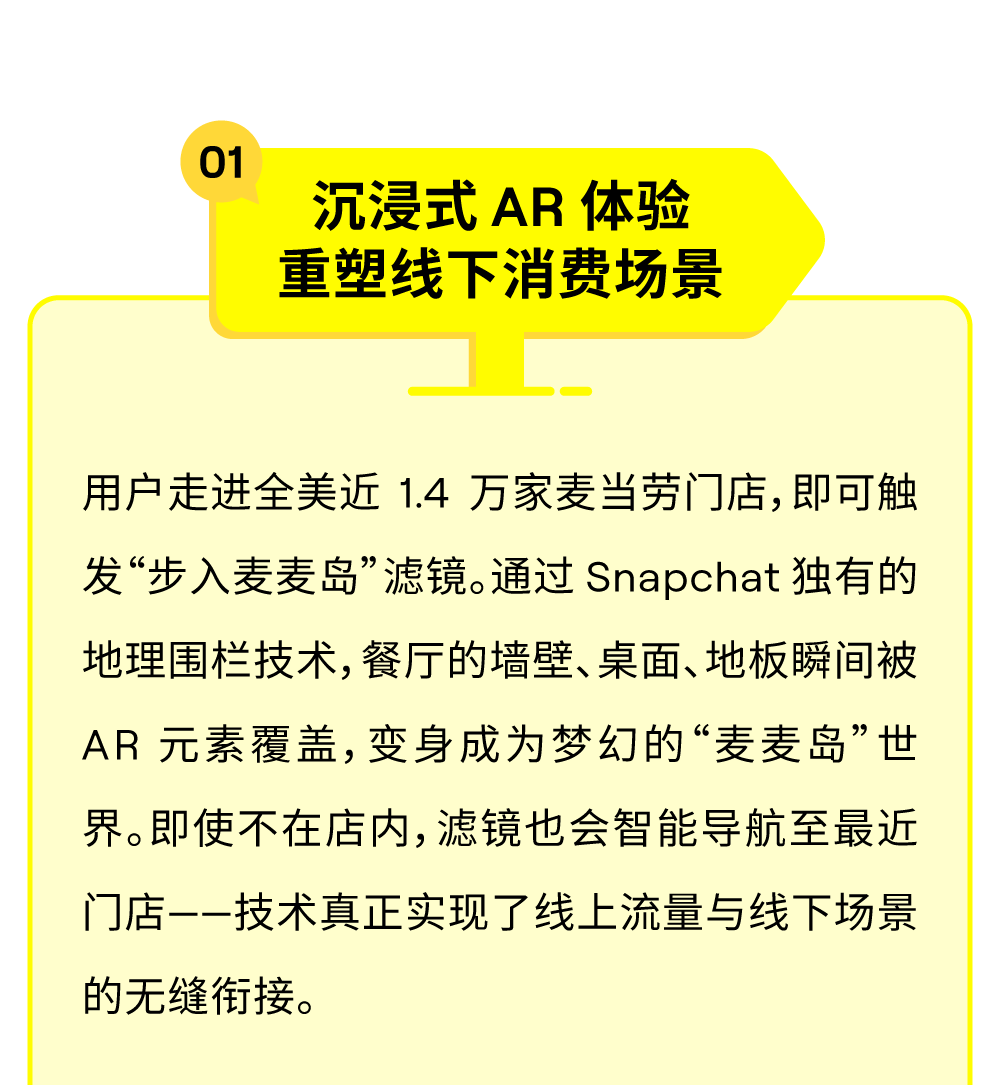 麦麦岛的故事曾经在 20 世纪 70 年代风靡一时,那个充满奇趣幻想的品牌 IP 世界,如今不仅通过“登陆麦麦岛”火爆回归,还经由 Snapchat 的 AR 技术全新亮相,为用户带来沉浸式互动体验,也为品牌广告主展示了 AR 营销的无限可能。 即日起,美国 Snapchat 用户可通过定制 AR 滤镜,进入“麦麦岛”奇幻世界:参与小游戏,解锁独家内容,甚至将身边的麦当劳门店通过 AR 技术“变身”成线上麦麦岛。这一切的背后,是 Snapchat 旗下 AR 创新工作室 Arcadia 的技术支持,以及地理围栏(Geofencing)、World Mesh 环境识别等前沿 AR 解决方案的成熟应用。 Snapchat 已为全球品牌提供了成熟的 AR 广告生态:从滤镜定制、互动游戏设计,到线下场景联动和效果追踪,助力品牌在海外市场实现声量与销量的双增长。 如果你也想用 AR 技术 为品牌打造沉浸式营销体验 欢迎联系 Snapchat 团队 解锁属于你的数字化新大陆!