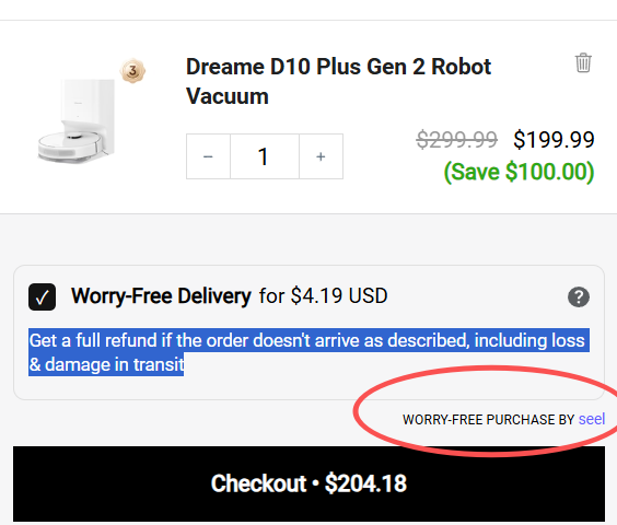 这或许是Seel模式最具革命性的一点。商家向用户收取的保障费用(如Dreametech的$4.19),并非简单的代收代付。Seel的AI模型会根据海量数据动态评估每笔订单的风险,并给出最优定价,比如高价值的产品,保障费会相对更高一些。