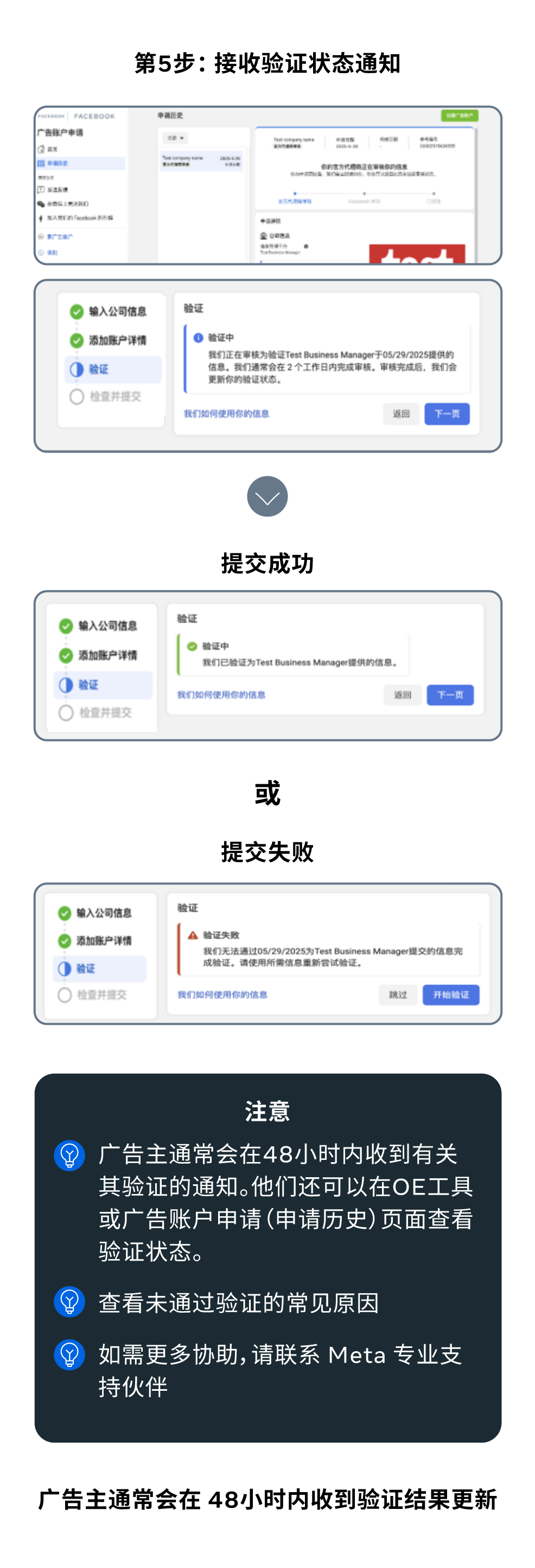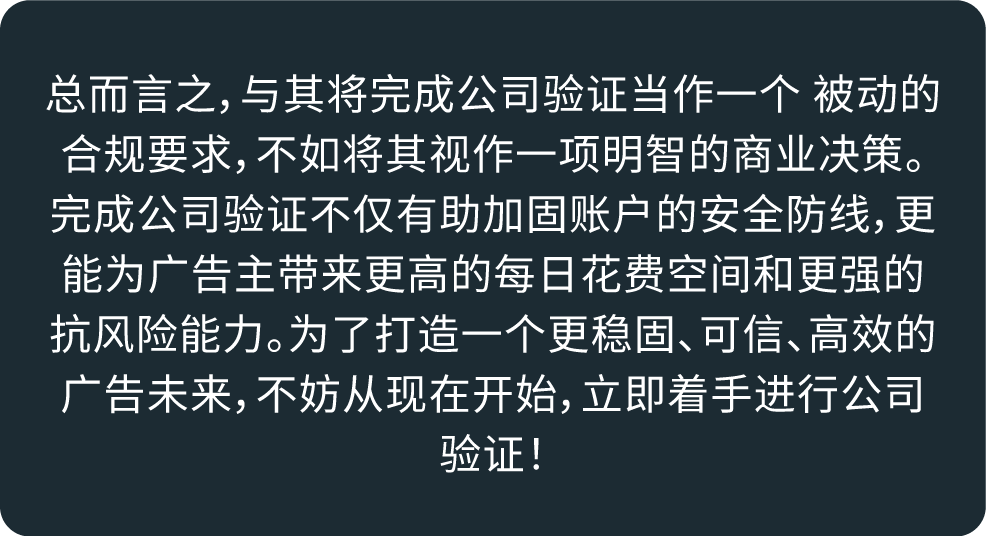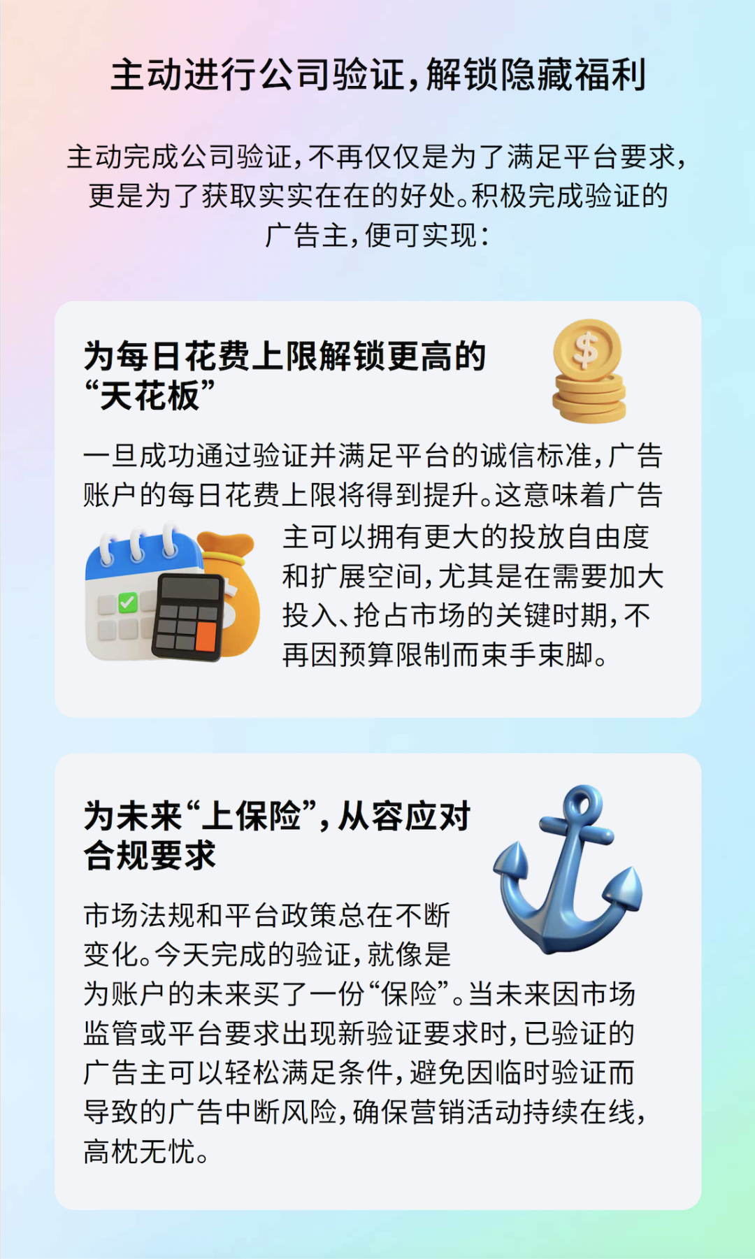 在瞬息万变的出海营销中,广告投放的稳定性和持续性是出海广告主最关心的问题。毕竟谁都不希望在营销旺季或关键推广节点,因为账户出问题而“掉链子”。 其实,要为广告账户的长期稳定打下坚实基础,有一个关键步骤常常被忽视:主动完成公司验证。 这不仅仅是一项合规流程,更是一项对未来的战略性投资。它能帮助广告主规避潜在风险,并解锁一系列“隐藏福利”,让广告投放之路走得更安稳、更长远。 出海广告主必须进行公司验证吗?为什么? 很多广告主可能会疑惑,为什么平台建议进行公司验证? 很简单,这一要求其实是Meta为了保障平台生态安全、遵守全球各地监管要求而采取的必要措施。 过去,这些验证要求可能在广告投放过程中突然出现,给广告主带来不便。而现在,情况正在改变。 全新流程上线,验证从未如此简单 为了让广告主能更简便地进行公司验证,Meta现已开始试点一个全新的、可主动选择的公司验证流程。 这个新流程目前正逐步向通过OE工具开设新广告账户的Meta非直客广告主开放。 相比以往的公司验证流程,新流程的最大亮点在于主动和便捷,广告主可以在创建账户的初始阶段,就选择主动完成公司验证。 这样一来,便可以将合规工作前置,将风险“扼杀”在摇篮中,整个体验也会更加丝滑流畅。 具体验证内容,一目了然 一提到“验证”,可能有些广告主会觉得流程复杂。其实,验证的内容并不神秘,通常会根据具体情况,涵盖以下一个或多个方面: