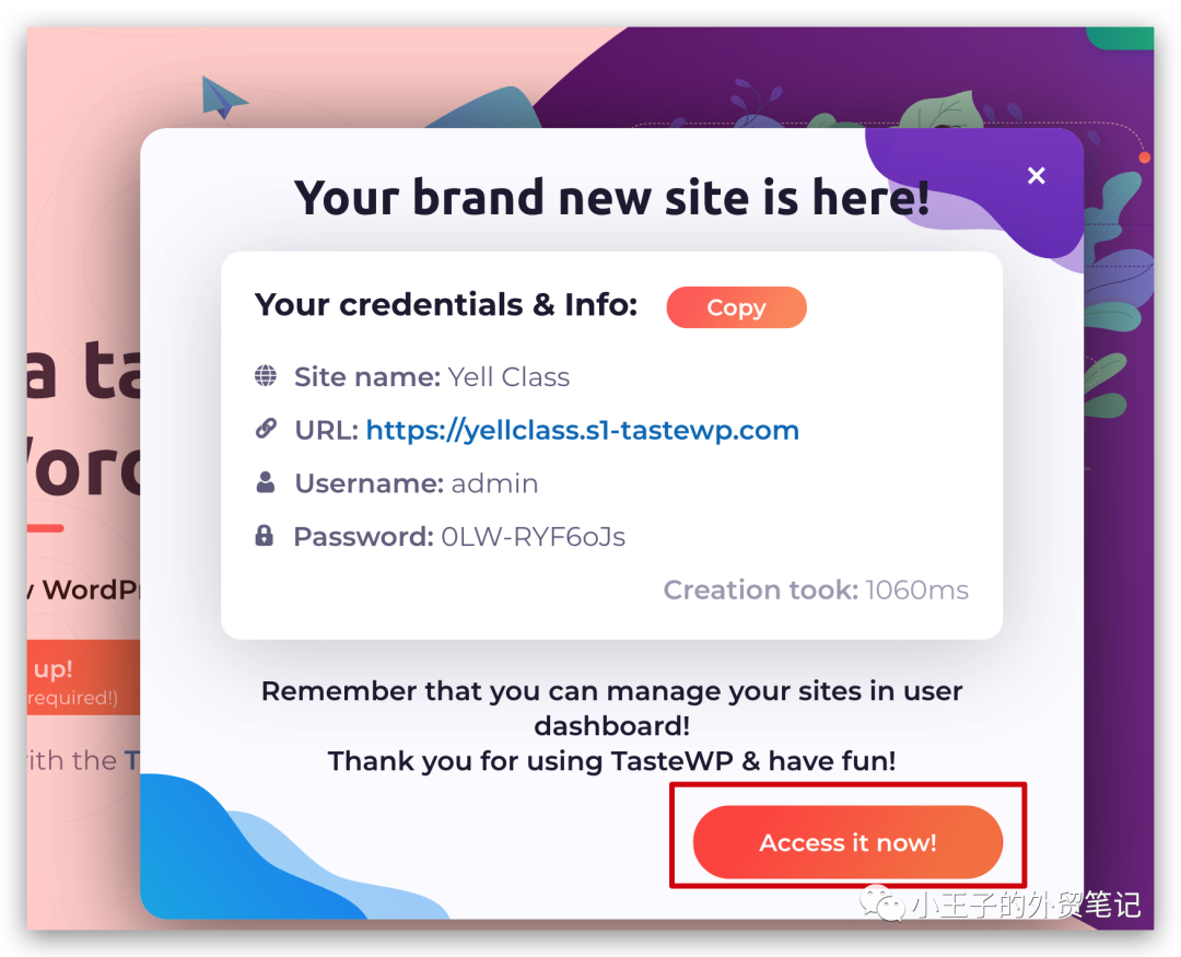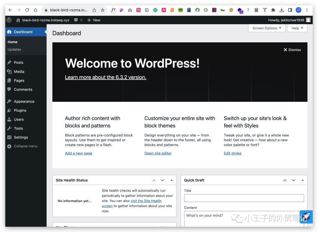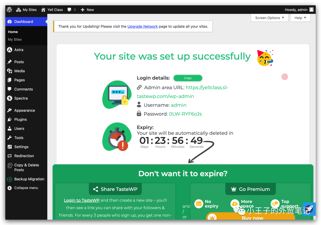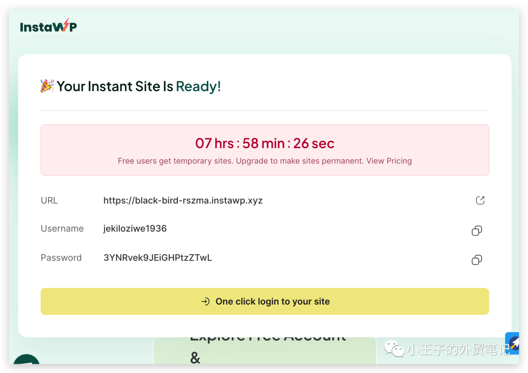 得到WordPress后台测试路径,然后点击One click login to your site一键进入测试环境