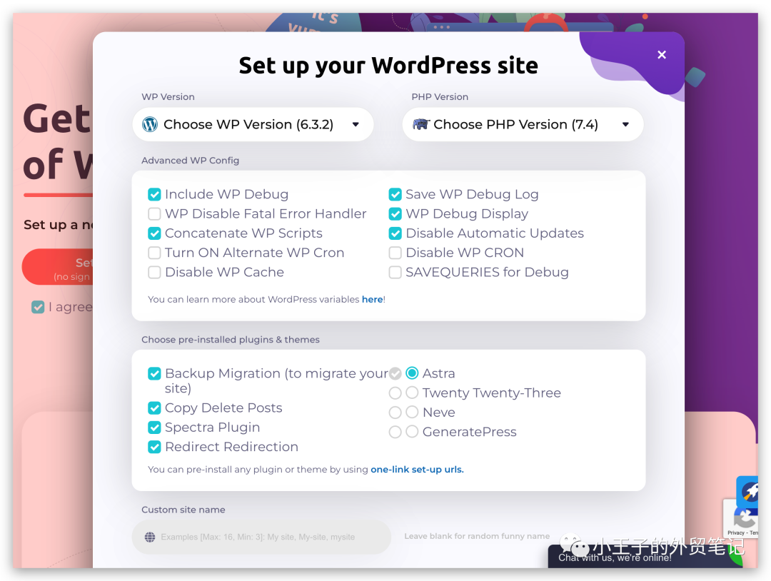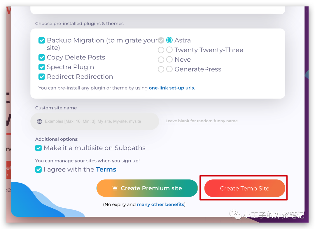 注册用户可以设置模板(上传安装自己的主题和插件),通过模板一键安装
