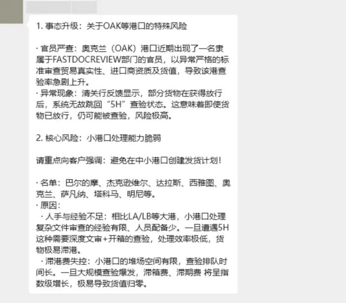 近期,第二轮海关5H再次全面爆发! 在此前,大部分卖家对5H查验认为是“普通开箱查验”;但经过第一轮5H查验,大部分美线卖家坐不住了,数千条中国货柜被强制退运。 5H查验的核心是“先文审、后实查”,由美海关与边境保护局(CBP)新成立的快速文件审查部门(FDR)主导; 审核范围覆盖:商业发票、装箱单、舱单、进口商资质、Bond有效性、HS编码、货值申报等全套资料; 常见的违规行动: 据行业数据可知,全美常规查验率从3%攀升至10%,而中国货柜在核心港口的查验占比高达84%! 此次5H检验潮给卖家带来多大影响: 1.本轮查验范围是全面扩散。 此前主要集中在洛杉矶、长滩等西海岸核心大港,两个就占全美集装箱海运贸易的3成左右,也是中国卖家出口的主要目的港。 而4月查验已快速蔓延至奥克兰、萨凡纳、西雅图等多个港口,其中奥克兰港更是成为本轮查验的重灾区。 2.卖家查验还出现了系统异常情况 有卖家放行后出现系统无故跳回的异常情况!哪怕货物已经拿到放行通知,依然面临二次查验的风险,清关的不确定性大幅提升。 3.大量走中小港口卖家风险更高 大量卖家为避开大港严查,选择中小港口,但中小港口的审查处理经验不足、处理效率极低,易导致滞港费、滞箱费呈指数级增长。 在当前这个环境下,卖家很难做到自己的货是百分之百安全的。 卖家该如何才能大程度降低损失: 2️⃣保证申报真实准确,杜绝低报瞒报货值、错报HS编码、品名模糊等违规操作; 4️⃣提前备齐合规认证,根据品类准备好资质文件,同时务必使用真实的进口商资质和自有Bond;