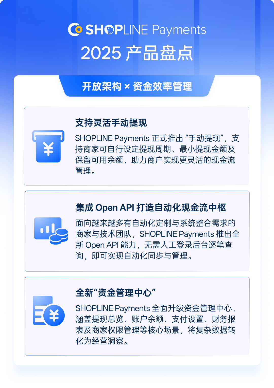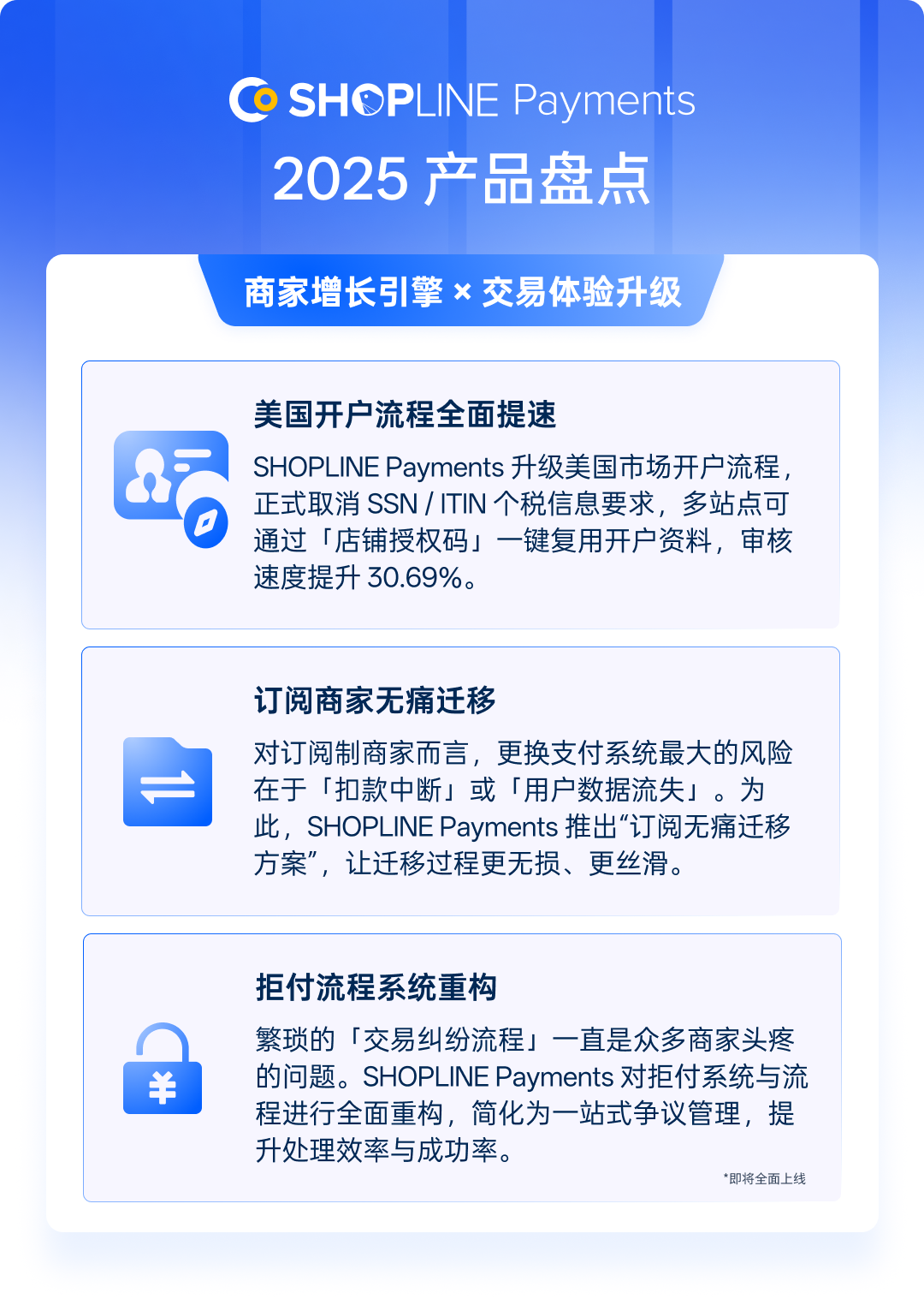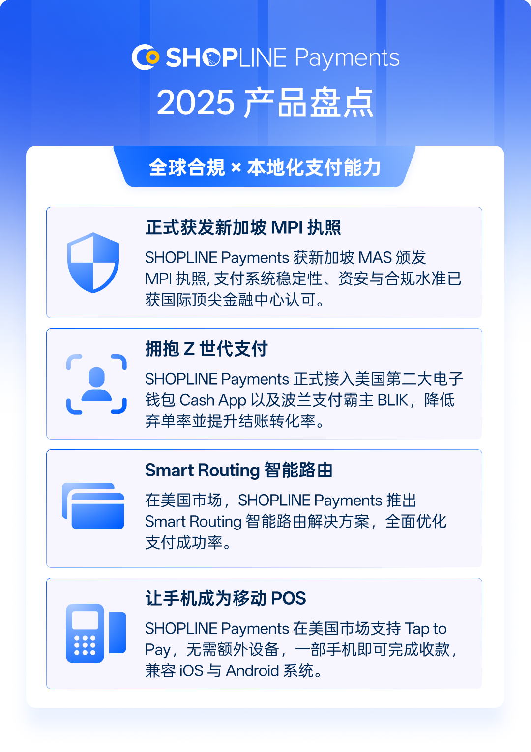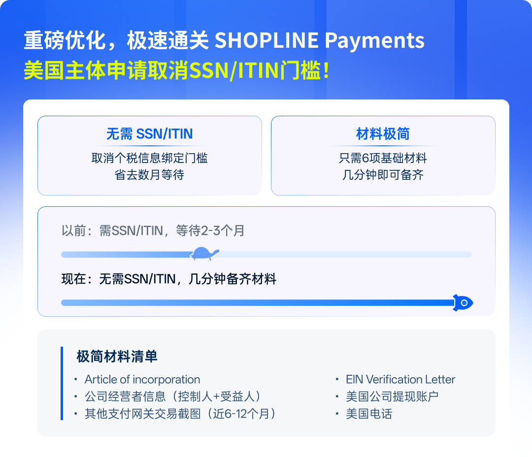 当支付不只是“收钱” 而是全球增长的引擎 2025 年,对 SHOPLINE Payments 来说,是从“把支付做好”正式迈向“把支付做全球”的关键一年。 这一年,我们服务的商家数持续增长,交易规模再创新高。越来越多的品牌不再满足于单一市场,而是将目光投向美国、欧洲、东南亚等高潜力市场。而支付,正是这条全球市场扩展路线上,最不能出错的一环。 SHOPLINE Payments 始终相信:真正好的支付,不仅要收得到钱,还要收得稳、收得快、收得合规,并能陪着商家一起走向世界。 因此,在 2025 年,SHOPLINE Payments 围绕三个核心方向实现了全面的优化升级: 全球合规 × 本地化支付能力:以新加坡 MPI 执照为合规底座,持续拓展多国主流支付,转化更高效。 商家增长引擎 × 交易体验升级:从开户、订阅商家迁移、到拒付流程全面优化,让每一笔成交更顺畅。 开放架构 × 资金效率管理:通过更开放的系统能力与更高效的资金管理机制, 让系统更灵活、更好用。 以下,我们将通过 10 项最关键的支付能力升级,带你回顾 SHOPLINE Payments 如何一步步打造一个 “更强、更全球” 的卓越支付体验。 一、 全球合规 × 本地化支付能力 01 正式获发新加坡 MPI 执照: 安全合规“硬实力”,带你稳赚全球 SHOPLINE Payments 已正式获得新加坡金融管理局(MAS)颁发的大型支付机构(Major Payment Institution, MPI)执照。这代表我们在支付系统稳定性、资安与合规水准已获国际顶尖金融中心认可,成为亚洲少数同时取得新加坡 MPI、香港 MSO、中国台湾数位发展部能量登录及澳洲 AUSTRAC 等多地支付牌照与监管资质的平台。 基于 MPI 执照所赋予的合规基础,SHOPLINE Payments 将持续深化与全球支付伙伴的合作,并进一步完善与支付深度整合的全链路电商解决方案,为商家提供更稳健、可扩展的全球支付与资金管理能力。 MPI 带来的核心价值 合规基础强化:支付服务运行于清晰、规范的监管框架之中,协助商家因应不同市场的合规要求,降低跨境经营风险。 全球支付整合能力:在稳固的合规基础上,更灵活地与各地支付方式及合作伙伴整合,支撑多市场、多币种的长期布局。 可持续扩展的支付能力:为未来引入更多嵌入式金融与进阶支付服务奠定合规与技术基础。 这不仅是一张支付牌照,更是一套经国际金融监管验证的长期能力基础。 SHOPLINE Payments 将持续以稳定、安全、合规为核心,陪伴全球商家稳健拓展跨境市场,为规模化成长铺设最可靠的一条路。 02 拥抱 Z 世代支付 助力商家全球本地化布局 在当今的全球跨境电商市场中,支付体验已成为决定交易成败的关键因素。数据显示,超过 43% 的海外消费者曾因结账流程繁琐而中途放弃交易,尤其是 Z 世代,对传统信用卡的依赖正逐渐被社交属性高的电子钱包取代。 顺应这一趋势,SHOPLINE Payments 正式接入美国第二大电子钱包 Cash App 以及波兰支付霸主 BLIK。这两种支付方式在当地市场都具备极高影响力: Cash App 在美国年轻族群中的渗透率高达 53% BLIK 可让波兰消费者的购买意愿提升 2.6 倍 通过提供这些高度本地化的支付方式,商家平均可降低 35% 以上的弃单率。在 SHOPLINE Payments 的实际应用中,结账转化率更进一步提升了 8%。 展望 2026 年,SHOPLINE Payments 将持续深化全球支付版图,陆续上线更多有影响力的本地支付工具,帮助商家以「当地人最熟悉的支付方式」完成每一笔交易,为消费者提供更便捷更高效的支付体验。 美国市场:即将接入主流先享后付(BNPL)平台 Affirm 法国市场:即将支持高度普及的本地卡支付 Cartes Bancaires(蓝卡) 荷兰市场:即将整合主流银行转账支付 iDEAL 03 Smart Routing 智能路由 成功率“秒杀”传统渠道 在美国市场,SHOPLINE Payments 推出 Smart Routing 智能路由解决方案,全面优化支付成功率: Smart Routing 智能路由核心能力 数据增强验证:通过数据驱动验证机制进行实时风险评估,在多数情况下无需额外用户交互,有效提升交易通过率。 动态择优路由:支持 Pulse、NYCE、Accel 等多个美国本地借记卡网络,由系统自动选择最合适的交易路径。 智能路由实测成果 多个品类(零售、男装、配饰、眼镜、电子)支付成功率明显提升,部分品类最高提升 7.21% 争议交易胜诉的比例提升 11.8% 2025 年数据显示,智能路由上线后,Apple Pay 的整体支付成功率增长 3.3%,真正实现了钱既能“收进来”,也能“守得住”。 04 打通线上线下最后一公里 让手机成为移动 POS 随着消费场景逐渐走向即时化与移动化,越来越多交易不再发生在固定柜台。然而传统的线下支付解决方案所依赖的 POS 终端不仅硬件成本高、部署流程复杂,也难以满足灵活经营的需求。为了给商家提供更灵活的线下即时支付方式,SHOPLINE Payments 在美国市场正式支持 Tap to Pay: 无需额外购买 POS 硬件,一部手机即可完成收款,兼容 iOS 与 Android 系统 支持 Apple Pay、实体感应式信用卡及主流 NFC 移动支付方式 非常适合市集、快闪店、移动销售等场景 这项能力大幅降低了线下收款的进入门槛,帮助商家以更低成本快速拓展线下渠道,真正实现线上与线下销售的无缝衔接。 二、 商家增长引擎 × 交易体验升级 05 美国开户全面提速 业务启动高效又省心 为帮助美国主体商家快速抢占市场,提升开户效率,SHOPLINE Payments 对美国市场开户流程进行了关键升级,全面取消 SSN / ITIN 个税信息要求,将原本需等待 2–3 个月的材料准备过程缩短至只需几分钟: 极简材